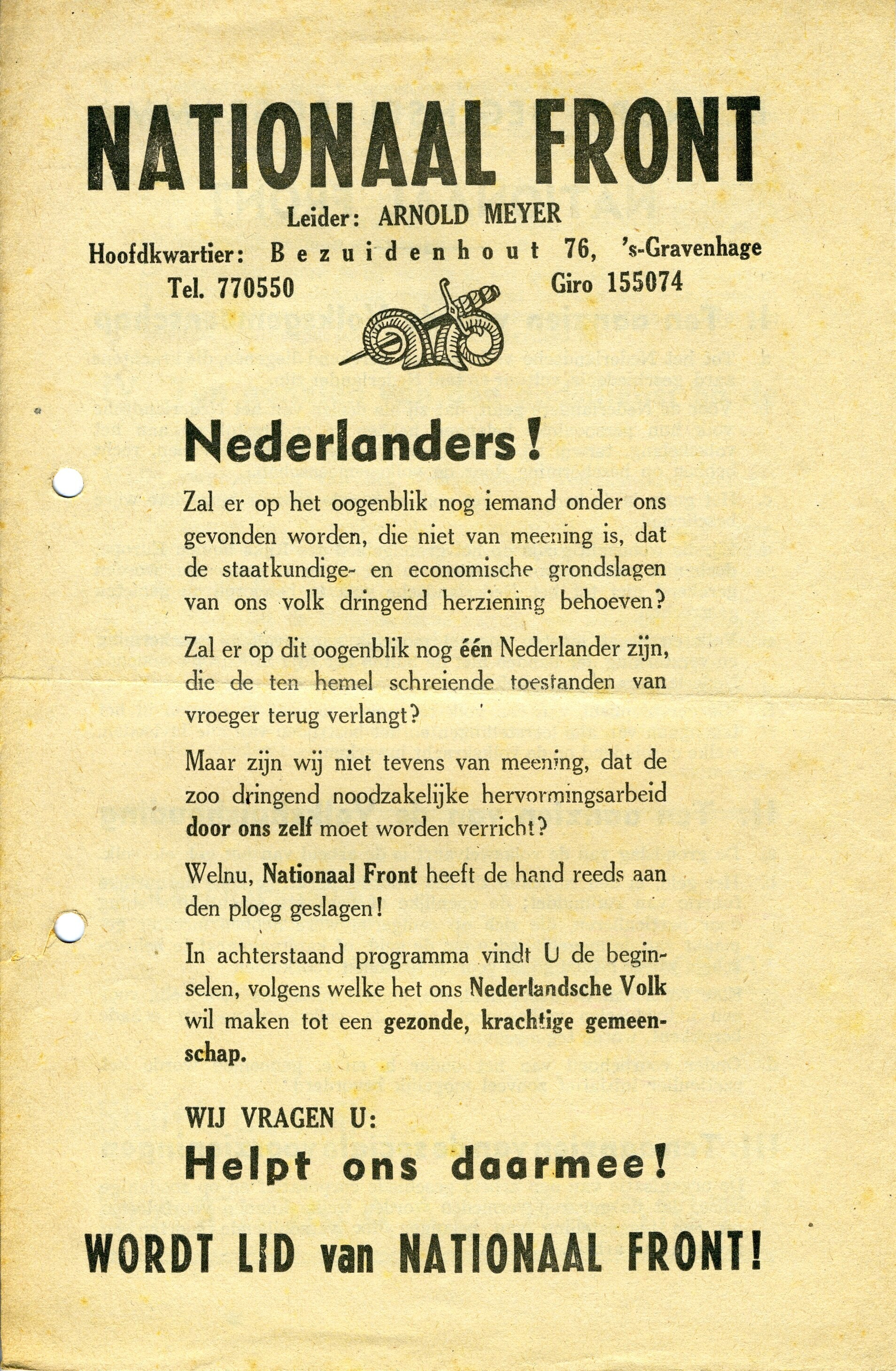 Een gedrukt pamflet met een oproep om lid te worden van het Nationaal Front onder leiding van Arnold Meijer met hoofdkwartier: Bezuidenhout 76 te Den Haag.