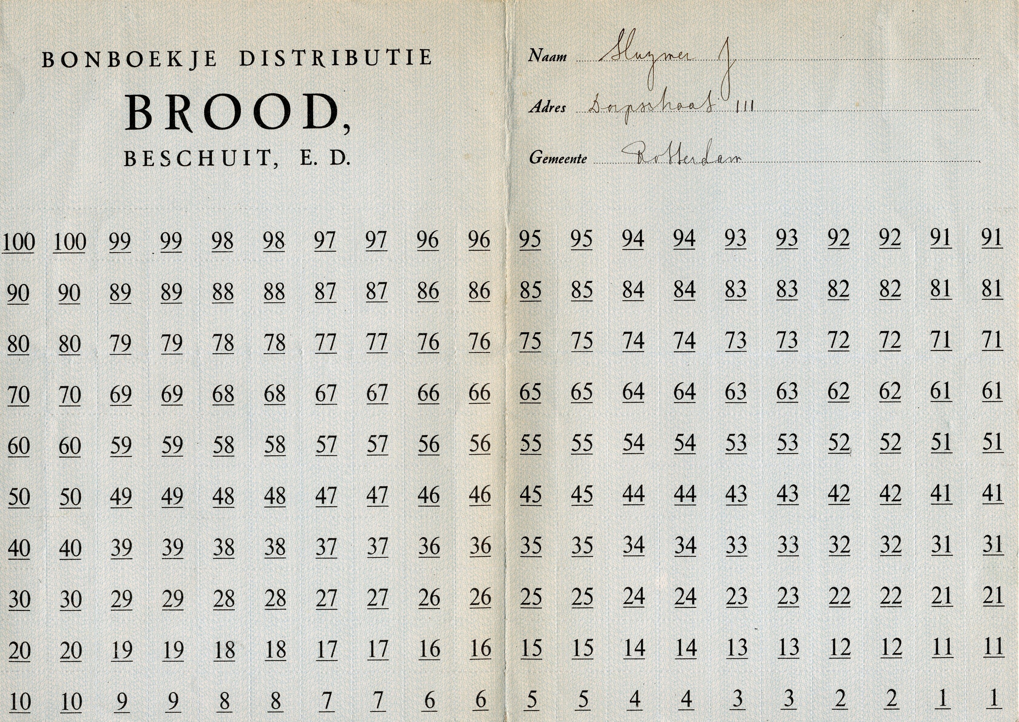 Een lichtblauw en een bruin bonboekje voor brood, beschuit ed. op naam van J. Sluymer (Sluimer), Dorpsstraat 111 Rotterdam. Een lichtpaarse noodkaart VA. Twee identieke opplakvellen consumentenbonnen groot formaat (Form. MD 147-02).