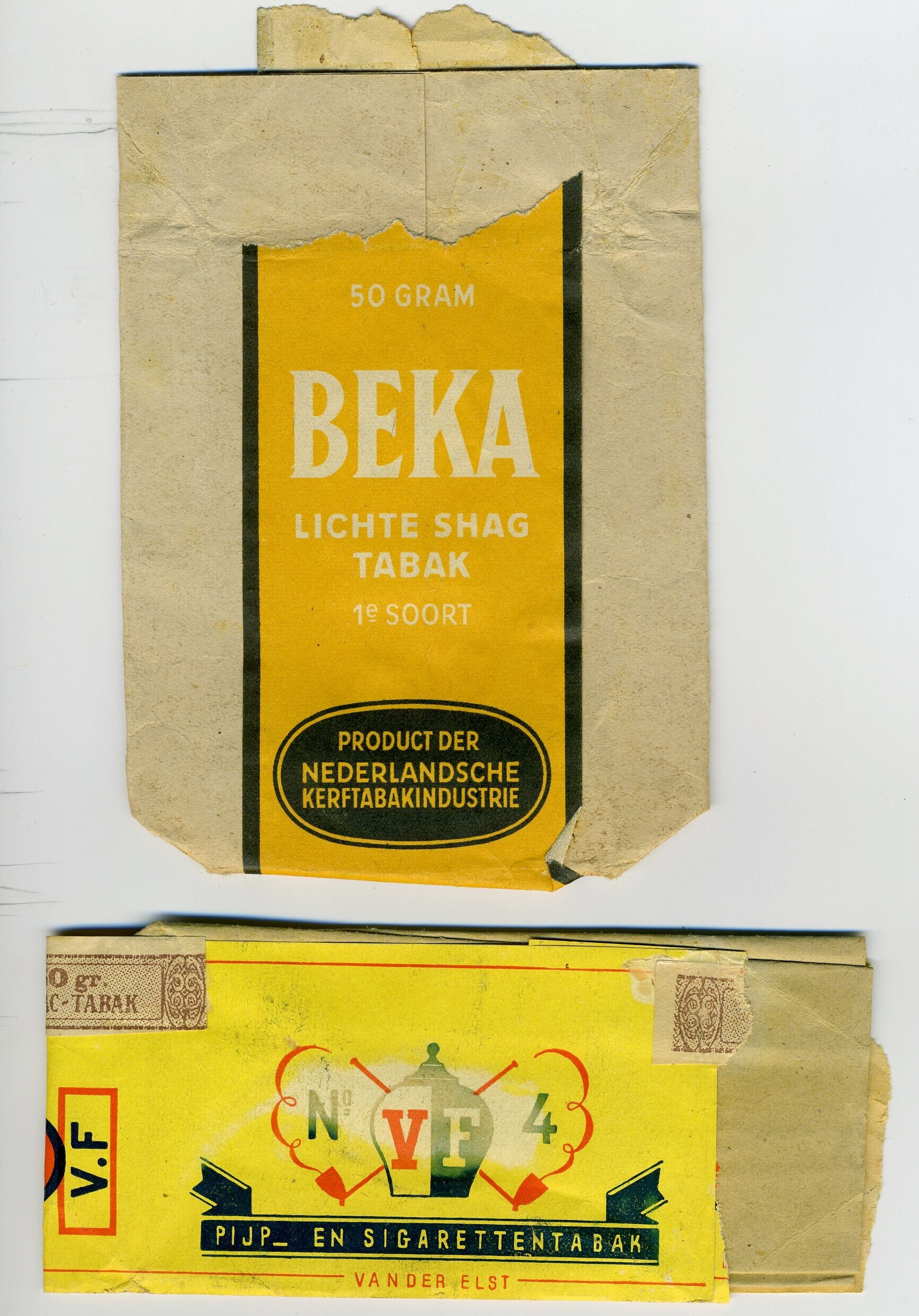 Twee verpakkingen voor pijp- en sigarettentabak. Een exemplaar Beka voor 50 gram lichte shag tabak. Het merk Beka ontstond in 1942 als gevolg van de schaarste aan tabak waardoor nog slechts vier tabaksfabrieken onder deze merknaam mochten produceren. Om de verpakking zit een lichtoranje gekleurde wikkel met zwarte opdruk met daarop de tekst: Product der Nederlandsche Kerftabakindustie. Op de achterzijde een smalle grijsblauwe wikkel waarop afbeeldingen van de Nederlandse leeuw en in rode opdruk de prijs: 70 cent.<br>Een gele verpakking van het Belgische merk Vander Elst voor 50 gram tabak. Op de verpakking een logo van een tabakspot met twee rokende pijpen en de tekst: VF no 4. Om de verpakking een lichtbruine wikkel met daarop de prijs van 400 frank.