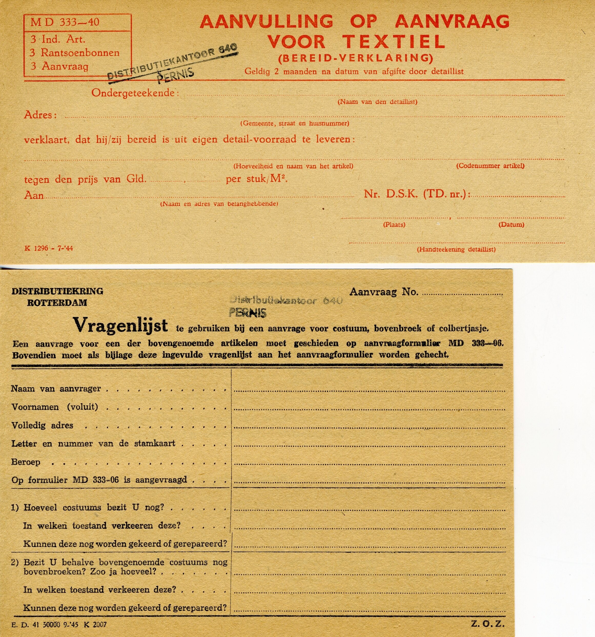 Blanco loketstaten en aanvraagformulieren die verband houden met de distributie van (extra) textielproducten, zoals jassen, mantels, boven- en onderkleding, kostuums en beddengoed. Op enkele formulieren staat een stempel: Distributiekantoor 640 Pernis.<br>Een document uitgegeven door de crisis- en distributiedienst van Den Haag voor extra rantsoenen voor zieken in de periode 5 t/m 9 mei 1944, op naam van R. Brumstede, Laan van Meerdervoort 512.