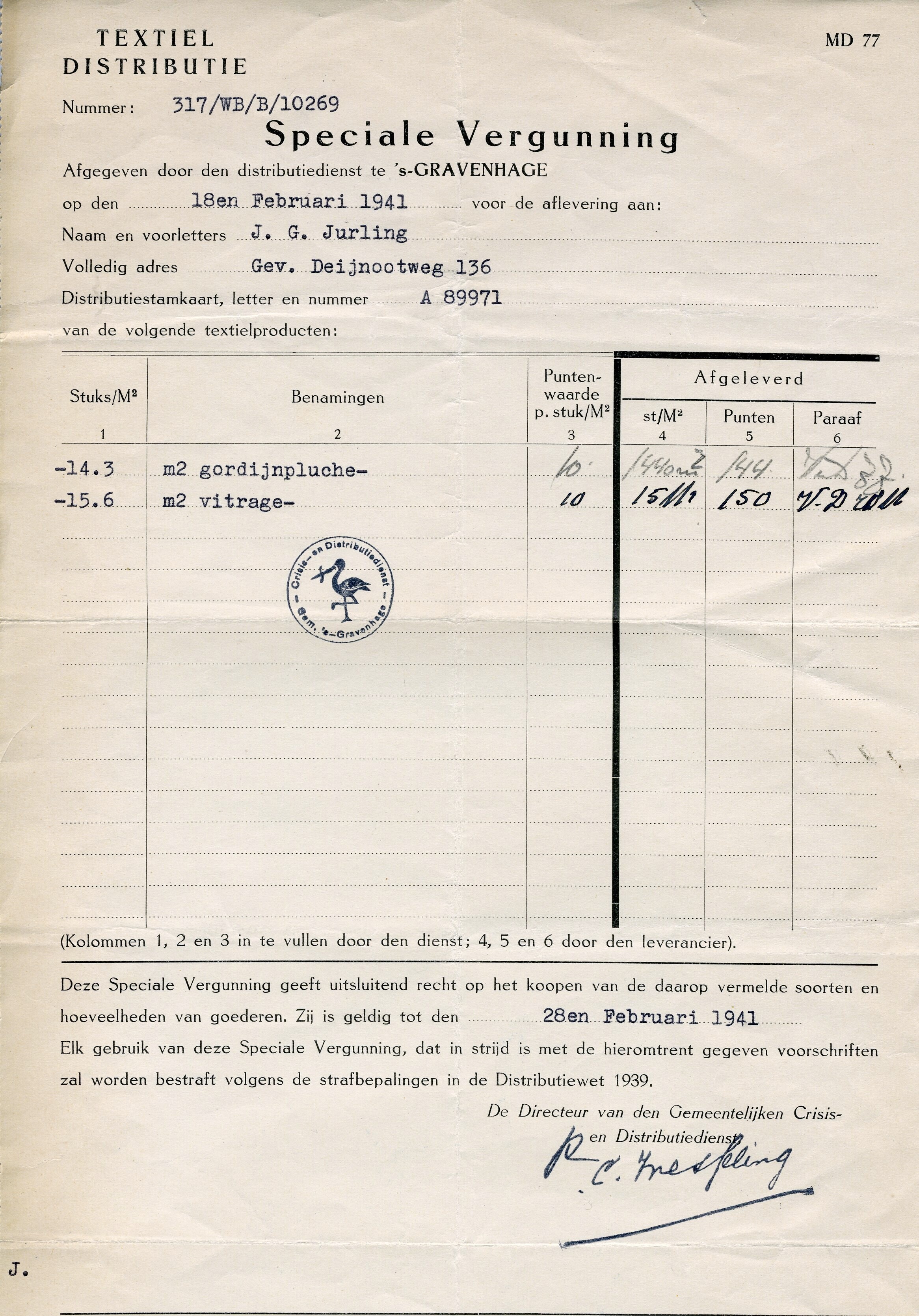 Twee documenten van de Distributiedienst Den Haag voor de aanvraag van textielgoederen en bedbenodigdheden. Het betreft een aanvraag voor bedbenodigdheden door J.E.V. Jurling op het adres Van Stolkweg 22b en een speciale vergunning voor textielproducten voor het adres Gevers Deijnootweg 136 op naam van J.G. Jurling. Het huis aan de Van Stolkweg moest wijken voor de Atlantikwall. De familie Jurling verhuisde naar Vlaardingen (Vondelingenplaat) en kreeg daar de beschikking over een bedrijfsvolkstuin waarvoor een deelnemersbewijs noodzakelijk was.