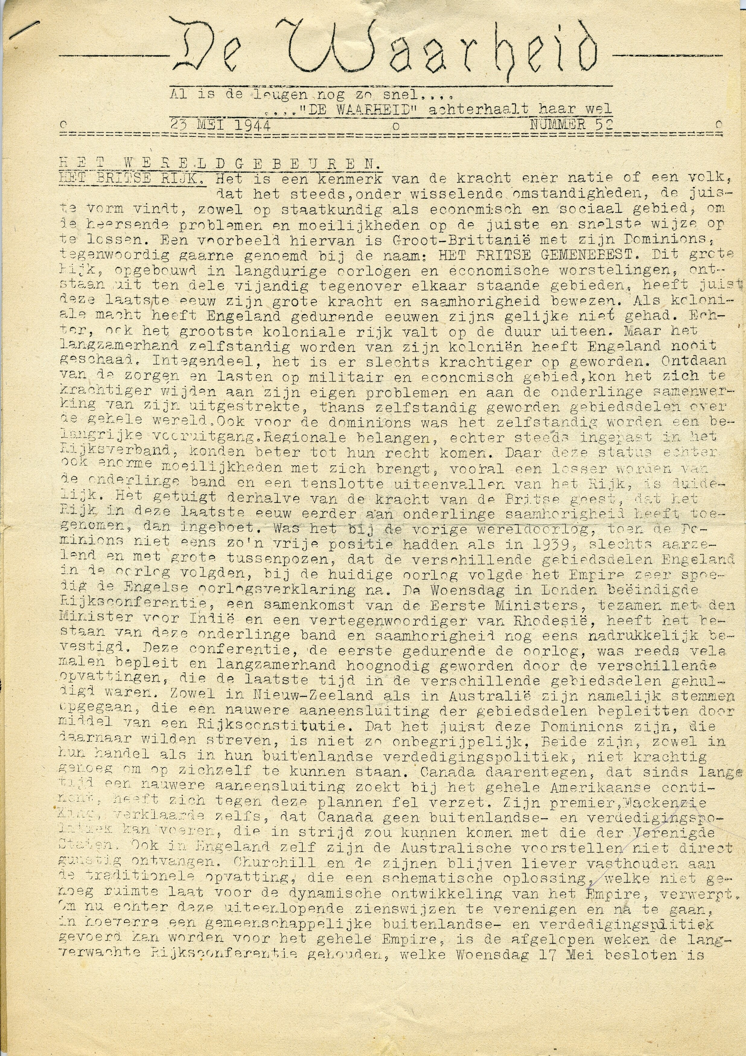 Tien gestencilde exemplaren van ''De Waarheid" uit 1944. Het betreft de nummer 52, (23 mei), 53 (26 mei), 55 (2 juni), 56 (6 juni), invasienummer (7 juni), 58 (9 juni), 59 (12 juni), 60 (14 juni), 61 (16 juni) en 62 (19 juni). De nummers zijn van verschillende afmetingen, enkele exemplaren zijn meerbladig en aan elkaar geniet.