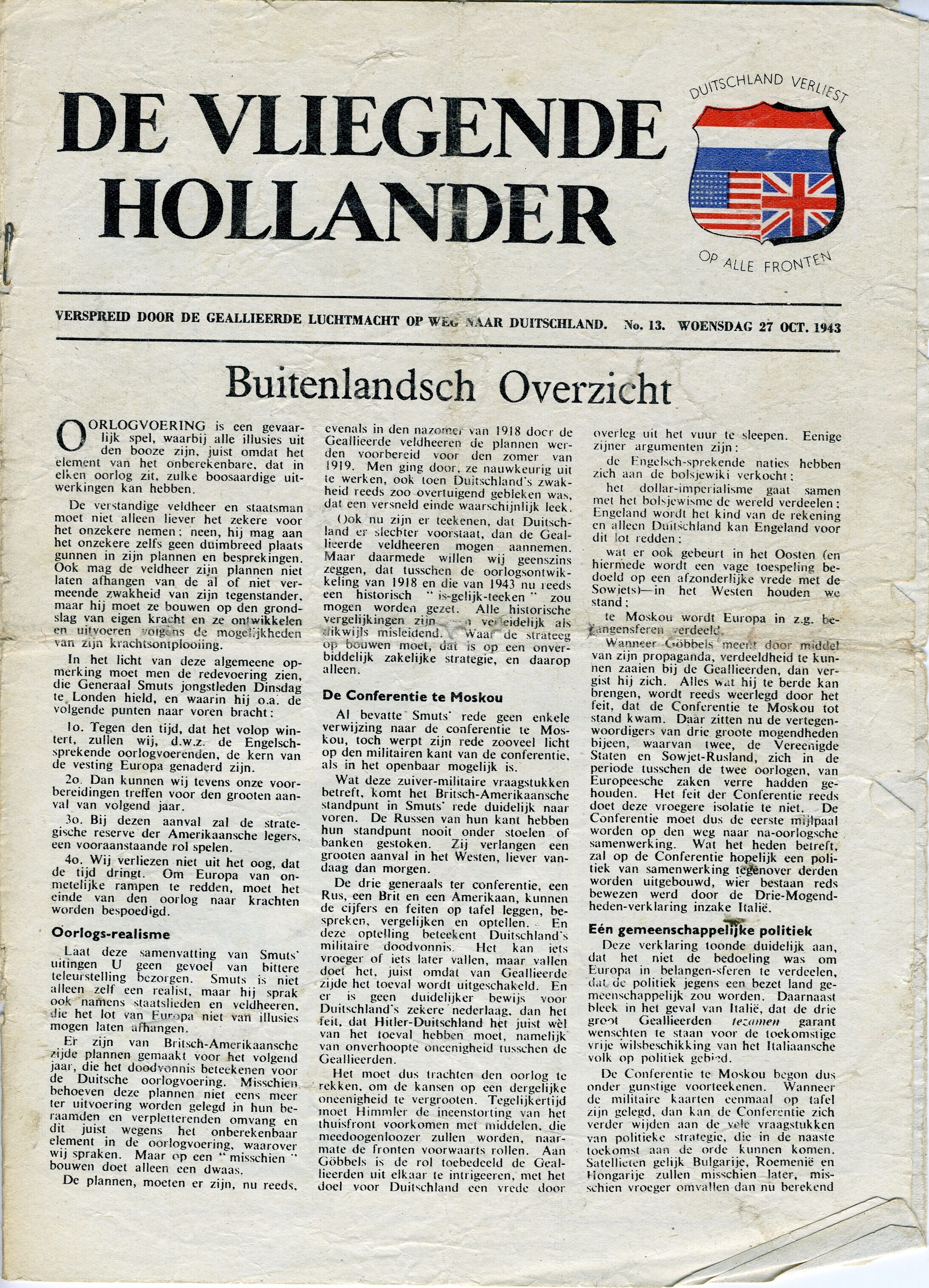 Zes exemplaren van het weekblad 'De vliegende Hollander', dat door de geallieerde luchtmacht boven Nederland werd uitgestrooid. Het gaat om de nummers 13, 19, 24, 25, 35 en 37 uit de periode 27 oktober 1943 tot en met 22 juni 1944. Het eerste nummer (13) heeft een andere vormgeving en afmetingen dan de overige exemplaren.