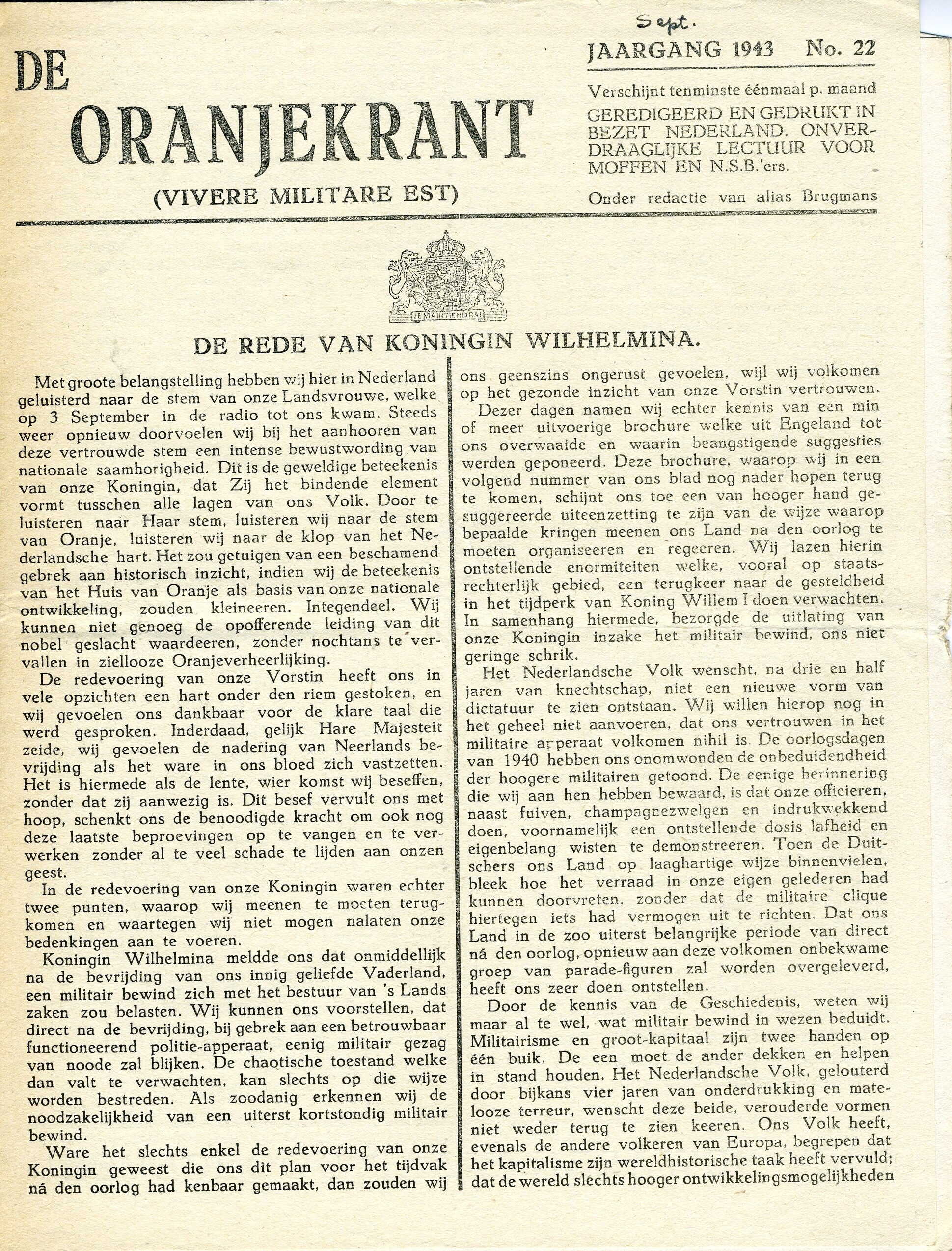 Exemplaar van ''De Oranjekrant". Het betreft nummer 22, jaargang 1943. Deze editie omvat vier pagina's. In de krant onder andere een rede van koningin Wilhelmina.