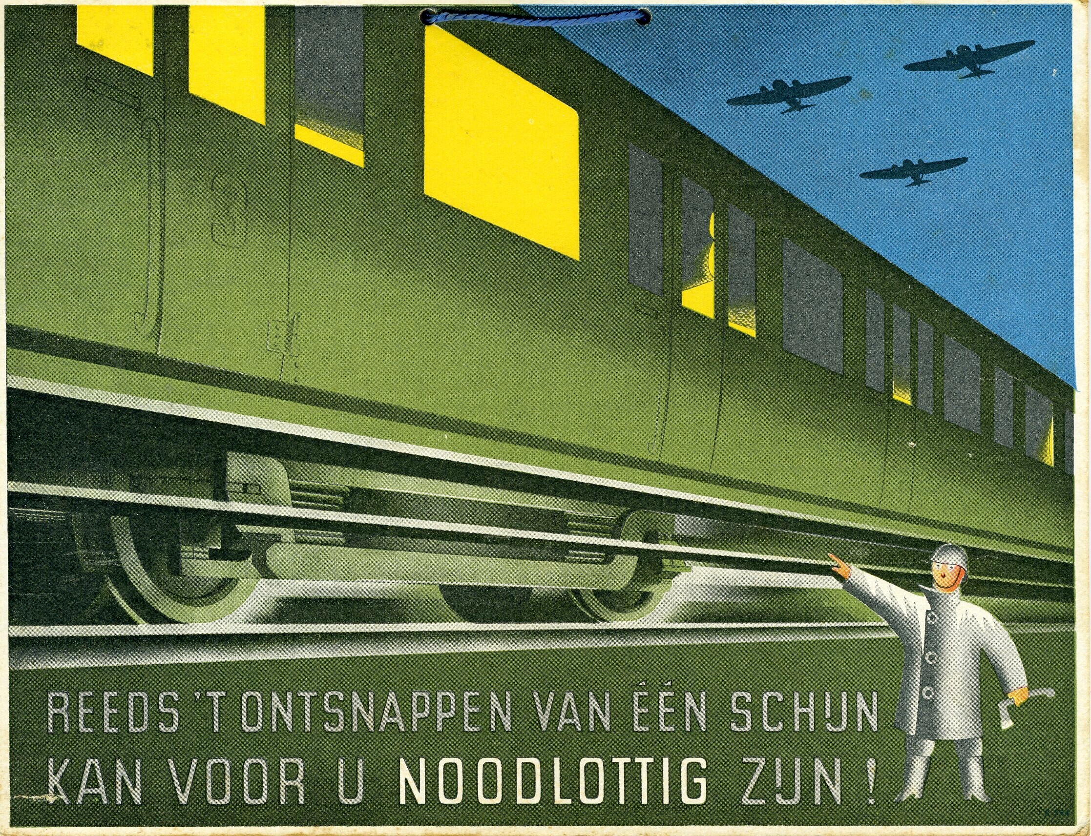 Dubbelzijdige affiche op hard karton met een kleurentekening van een voorbijrijdende verlichte trein met in de donkere avondlucht de silhouetten van drie vliegtuigen. Op de voorgrond een wijzende figuur. Op de affiche de tekst ''Reeds 't ontsnappen van een schijn kan voor u noodlottig zijn!''. Aan de affiche is een koordje bevestigd zodat het kartonnen bord kan worden opgehangen.