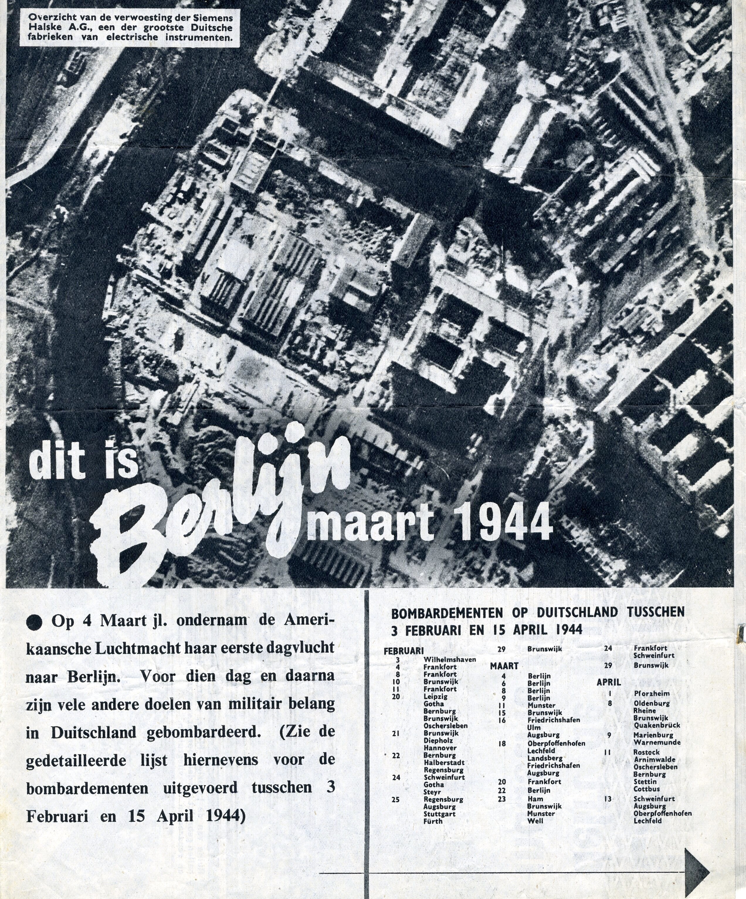 Geïllustreerd strooibiljet met foto's en een beschrijving van de bombardementen op Berlijn en andere Duitse steden in 1944. Het strooibiljet is uitgegeven door het Amerikaansche Bureau voor Oorlogsinlichtingen en verspreid door de Amerikaanse luchtmacht.