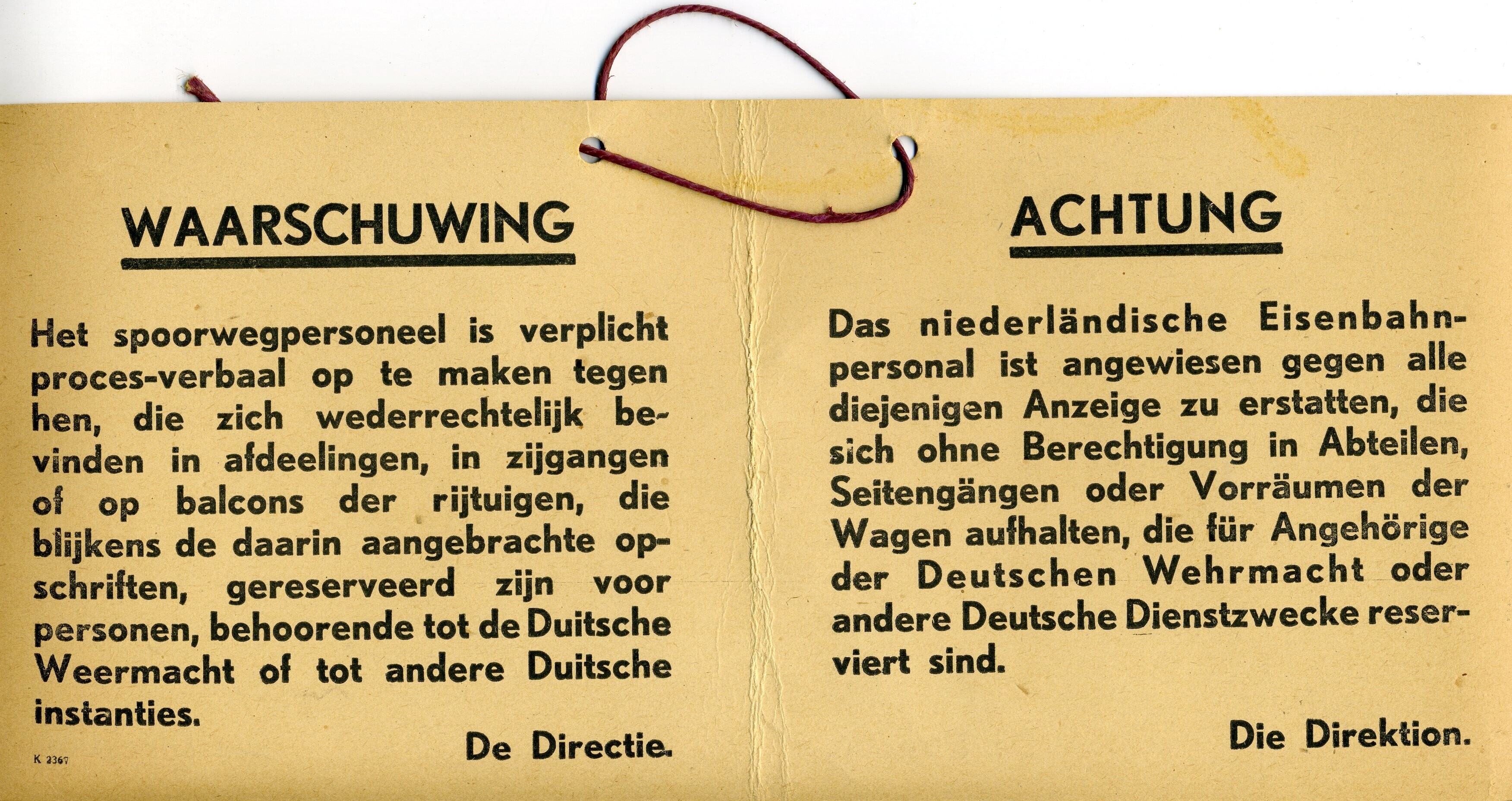 ''Waarschuwing'' waarmee in het Duits en Nederlands wordt aangegeven dat er proces-verbaal wordt opgemaakt tegen diegenen die op de gereserveerde plaatsen van de Weermacht of van andere Duitse instanties plaatsneemt. De waarschuwing is gedrukt op hard karton en kan worden opgehangen aan een koord.