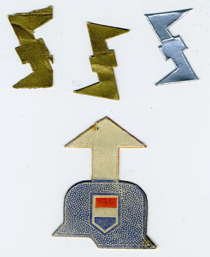 Vier papieren emblemen van de N.S.B.: een blauwe helm met de 'Prinsenvlag' met daarop een pijl. Op de achterkant is met potlood geschreven: "Frontzorgcollecte 27 mei 1944''; twee zilverkleurige en één goudkleurige papieren Wolfsangel.