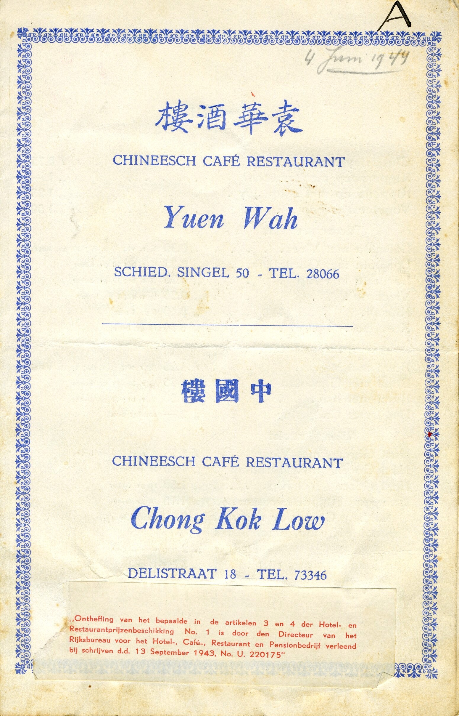 Vier menukaarten uit de periode 1943- 1944. Het betreft een menukaart van een Chinees Café Restaurant in Schiedam/Rotterdam. Op de menukaart zijn met pen wijzigingen aangebracht. Een menukaart van '''t Goude Hooft'' in Den Haag van 21 juni 1944 met een menu met bon en een menu zonder bon. Daaraan vastgeniet een getypt menu klasse C. Een prijskaart van ''Heck's lunchroom'' in Den Haag van 29 juni 1944 met op de achterzijde de dagschotelkaart met een menu met en zonder bon. Daarbij een kaartje met een mededeling over bedieningsgeld, met potlood gedateerd op 29 juni 1944. Menu van de Restauratie van het Centraal Station Utrecht van 12 november 1943.