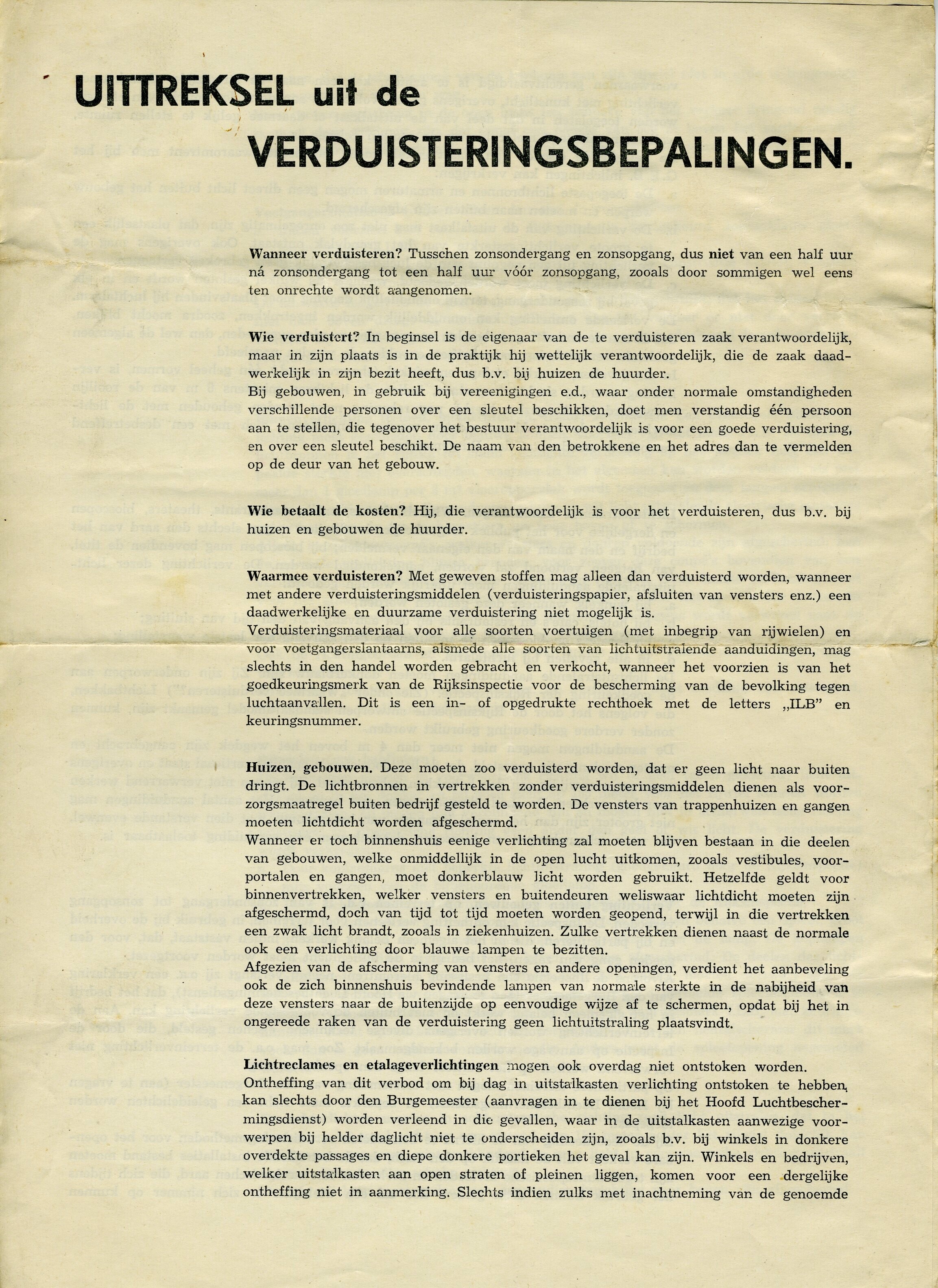 Uittreksel uit de verduisteringsbepalingen waarin wordt aangegeven wanneer en door wie er verduisterd moet worden. De voorschriften omvatten vier pagina's.