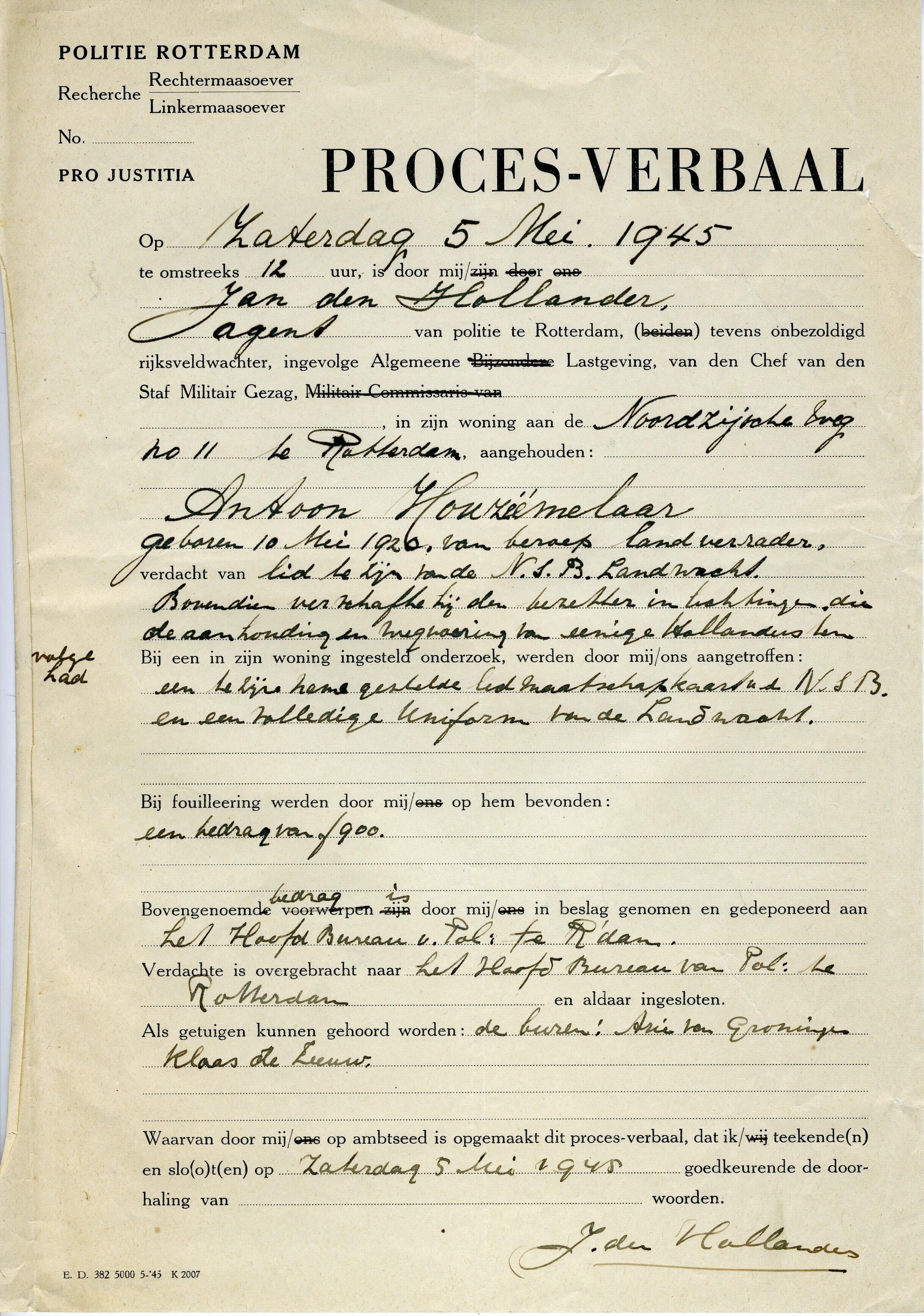 Vijf documenten van de politie Rotterdam. Het betreft drie processen-verbaal waarvan twee blanco. Eén proces-verbaal is ingevuld op 5 mei 1945 en betreft een quasi aanhouding van een N.S.B-er ''Antoon Houzeemelaar''.<br>Een oproep te verschijnen bij de politie voor het verrichten van persoonlijke diensten op 15 januari 1943.<br>Een signalementenlijst waarop met rood potlood is geschreven "vervallen''.