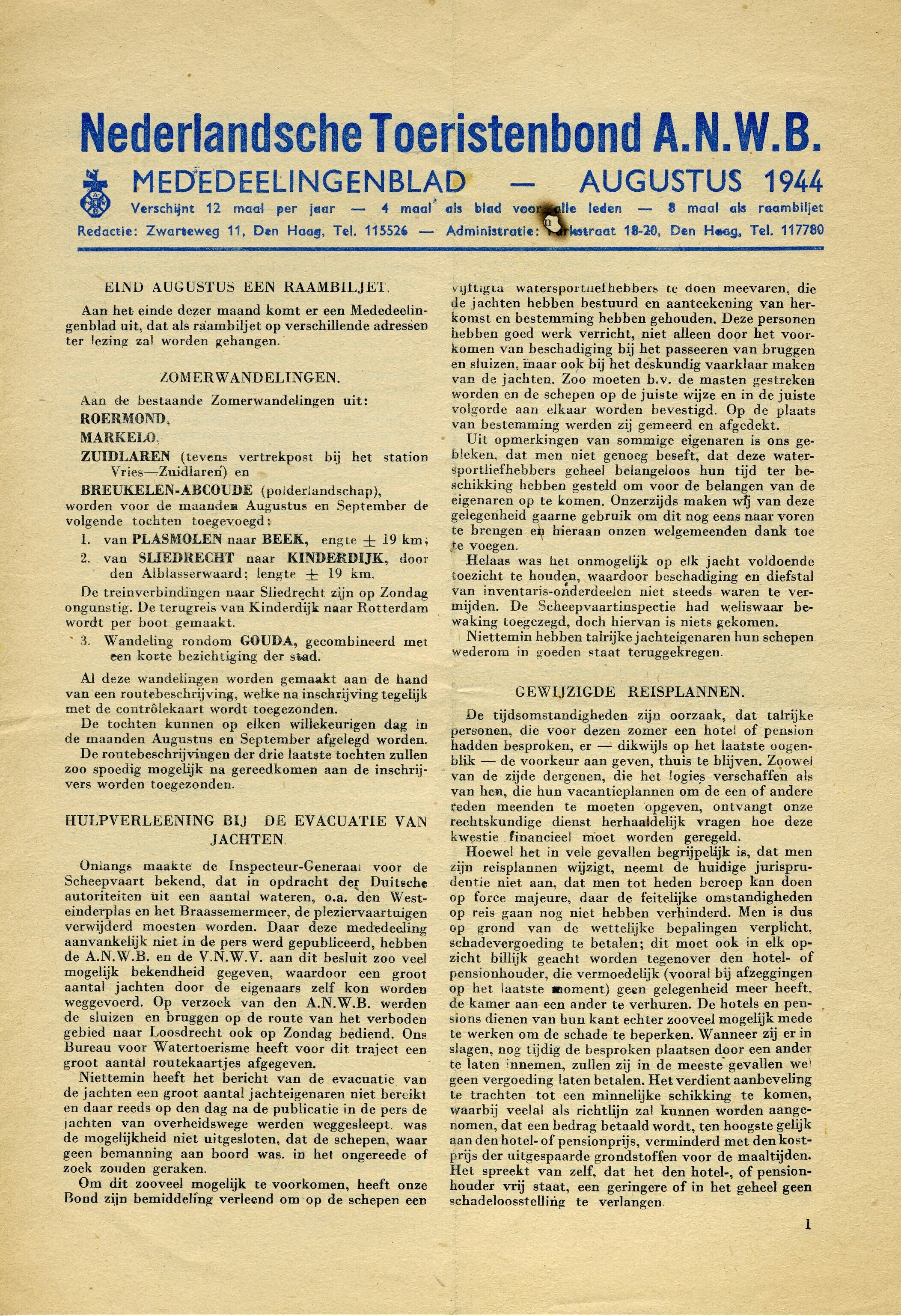 Exemplaar van het Mededelingenblad van de A.N.W.B. van augustus 1944. De uitgave omvat vier pagina's.