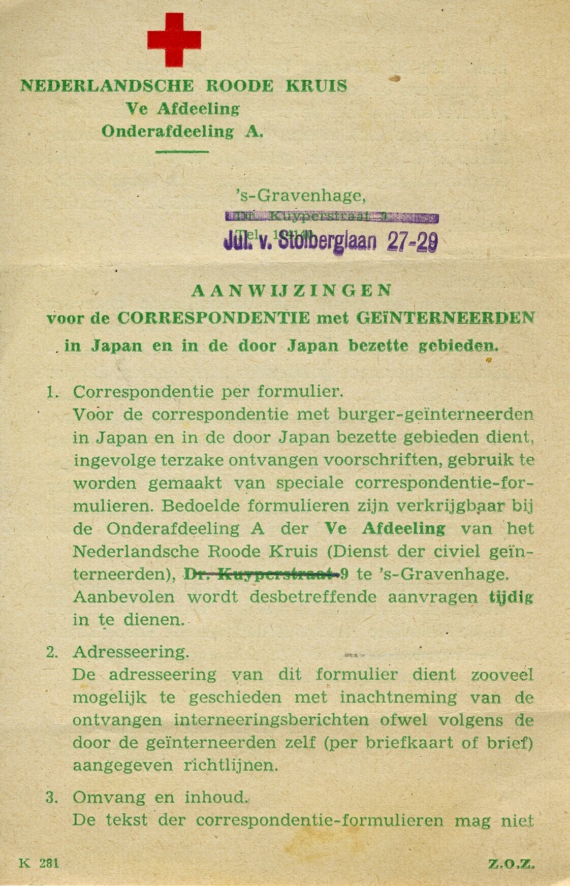 Twee aanwijzingen voor het gebruik van formulieren voor het indienen van een verzoek om inlichtingen over burgerpersonen in het buitenland. En een drukwerk van het Rode Kruis met aanwijzingen voor correspondentie met geïnterneerden in door Japan bezette gebieden.