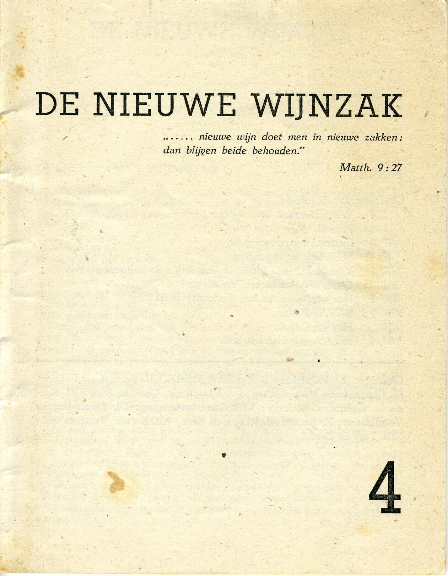 Editie nummer 4 van De Nieuwe Wijnzak van augustus 1944. ''Leidraad tot verdieping van het staatsburgerlijk denken, door en voor werkers en verzetters.'' De editie omvat 30 pagina's.