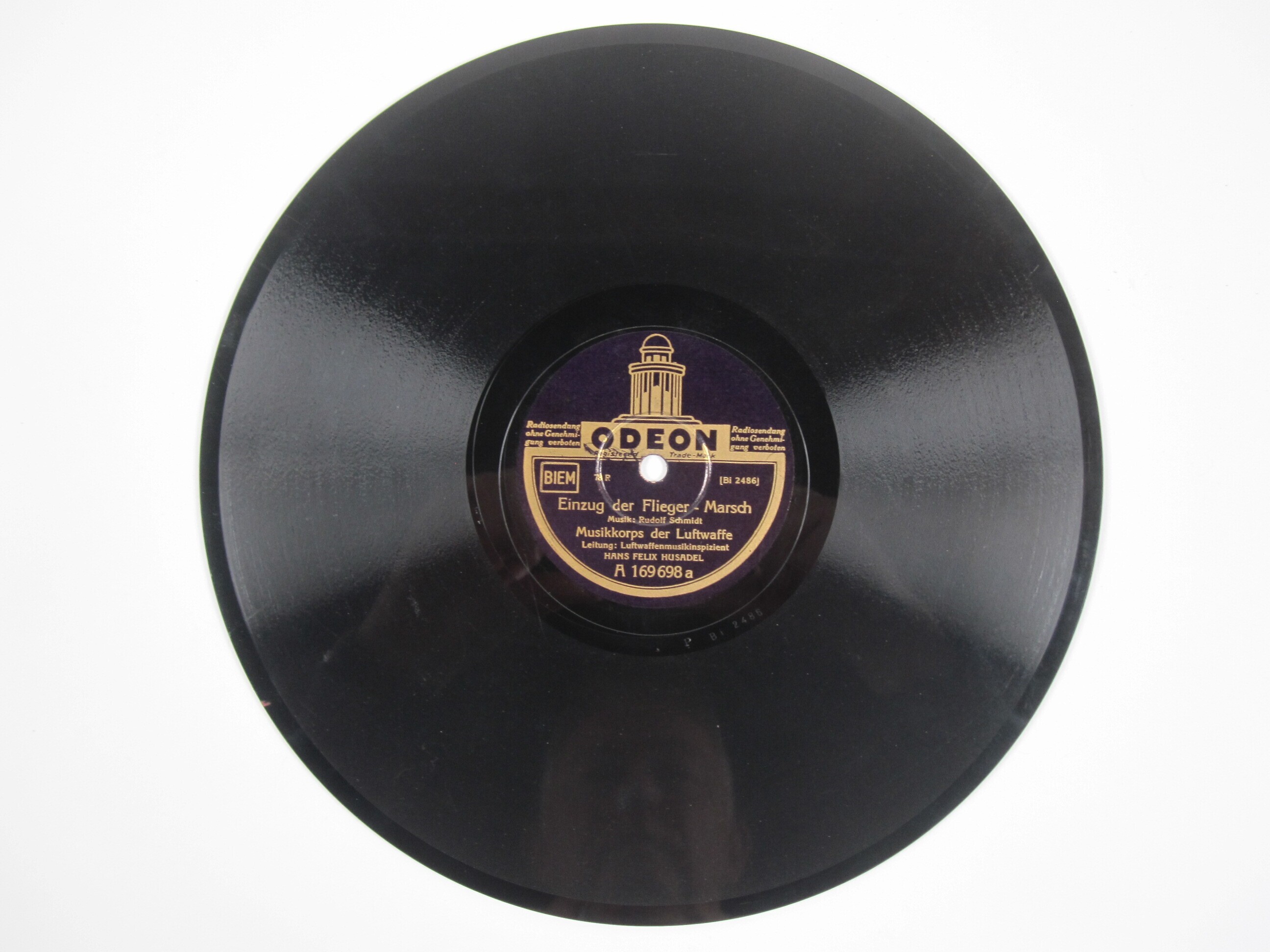 Een grammofoonplaat van het platenlabel "Odeon" met op één kant: "Einzug der Flieger - Marsch. Musik: Rudolf Schmidt. Musikkorps der Luftwaffe. Leitung: Luftwaffenmusikinspizient Hans Felix Husadel. A 169698 a". Op de andere kant: "Fliegerparade - Marsch. Musik: Gustav Rath. Musikkorps der Luftwaffe. Leitung: Luftwaffenmusikinspizient Hans Felix Husadel. A 169698 b".