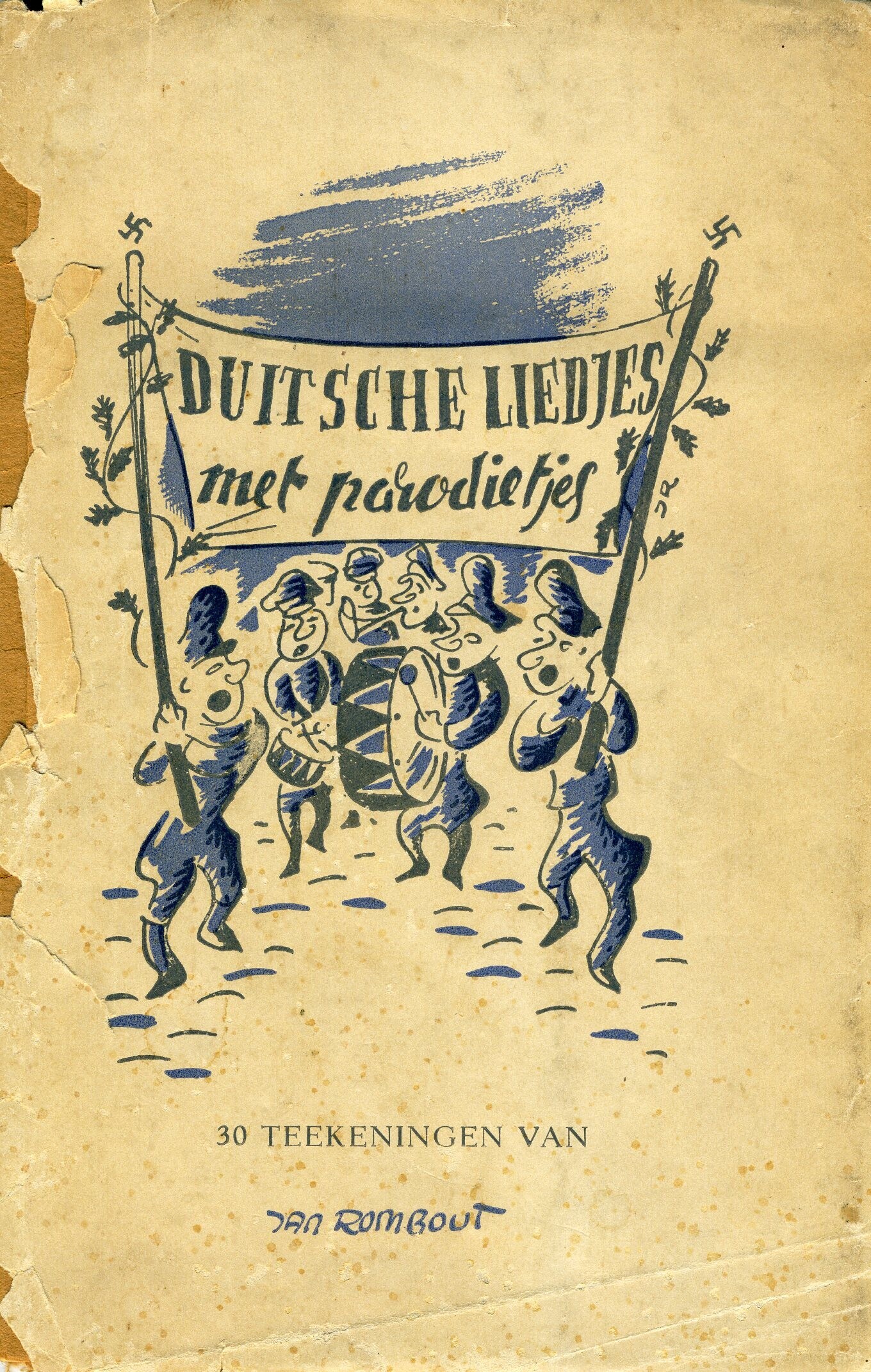 Een boekje getiteld: "Duitsche liedjes met parodietjes" met "30 teekeningen van Jan Rombout". In het boekje zijn 30 titels van liedjes in het Duits vergezeld met een spotprent afgedrukt.