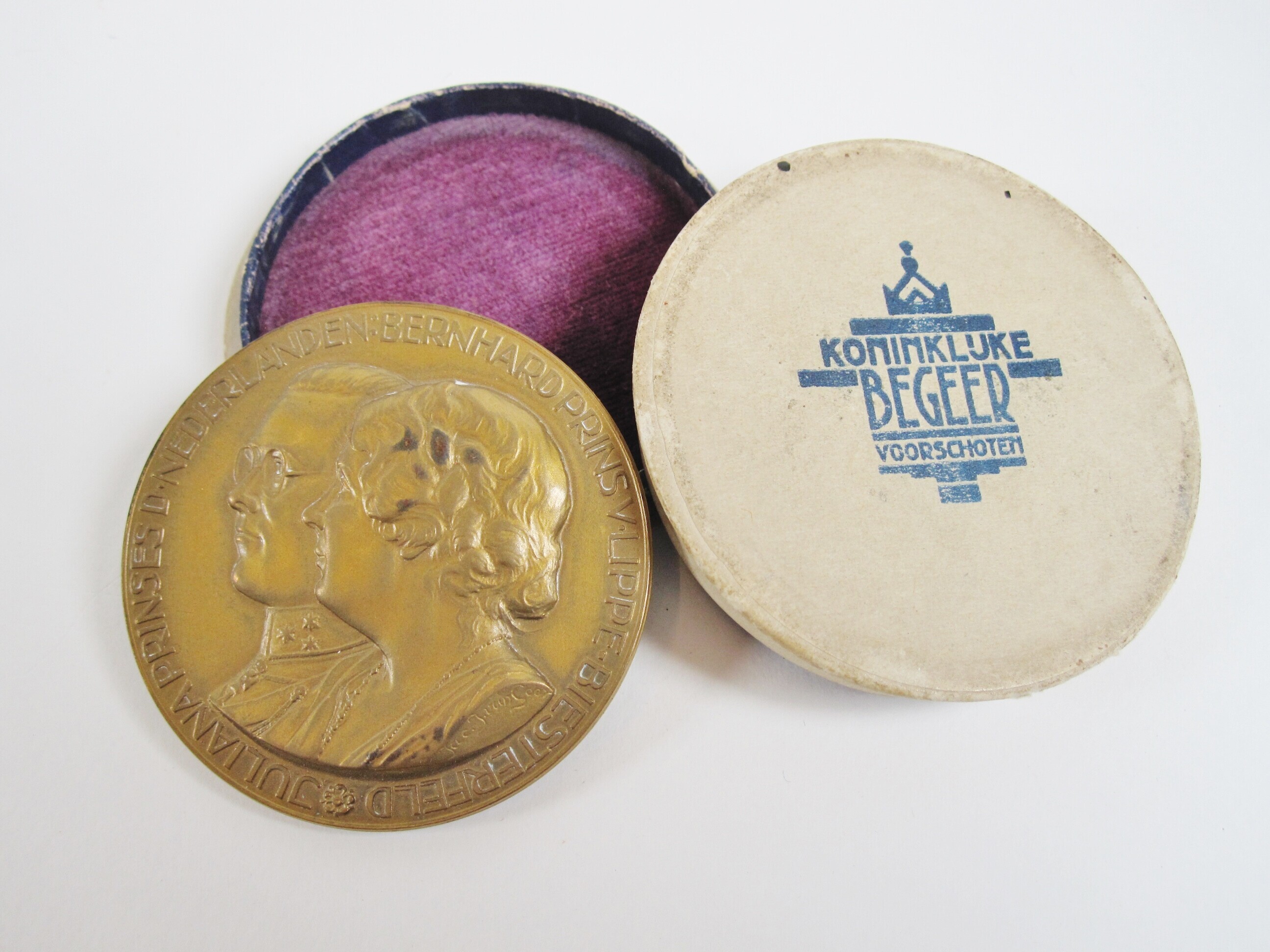 Een bronzen penning met op de voorkant de portretten van prins Bernhard en prinses Juliana met daaromheen: "Juliana prinses d. Nederlanden: Bernhard prins v. Lippe-Biesterfeld" en op de achterkant: "Departement van Justitie. Ter herinnering aan den verrichten dienst te 's Gravenhage 7 januari 1937", in het originele ronde kartonnen doosje met op het deksel: "Koninklijke Begeer Voorschoten". Op de onderkant van het doosje is met pen geschreven: "Barend Uiterwijk".