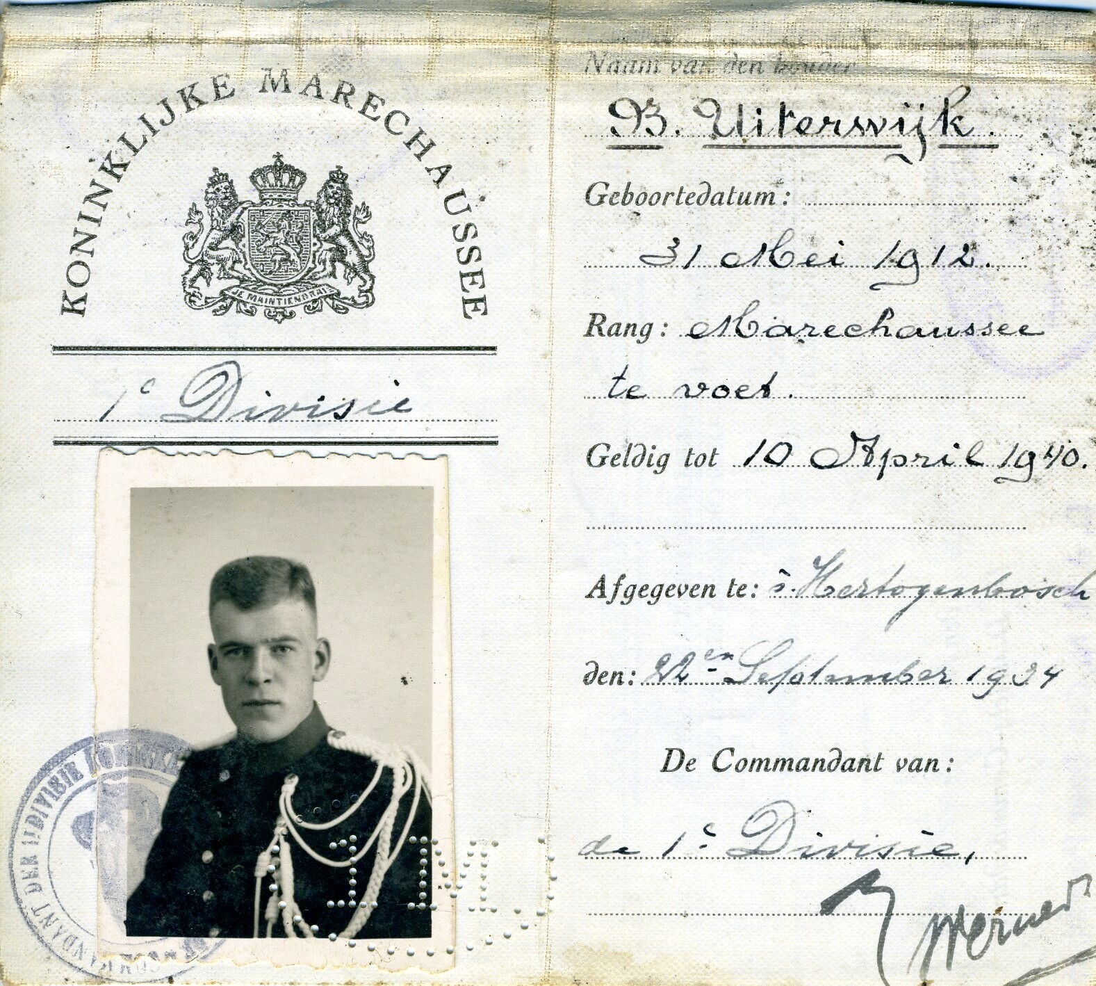 Een zakboekje van de Koninklijke marechaussee op naam van Barend Uiterwijk afgegeven op 11 april 1934 te Apeldoorn met een legitimatiebewijs van B. Uiterwijk, marechaussee te voet met pasfoto afgegeven op 22 september 1934 te 's-Hertogenbosch. In het zakboekje staan naast de personalia de ontvangen uniformonderdelen en overige uitrustingstukken ook de inkomsten en schulden genoteerd tot aan 1 april 1940.
