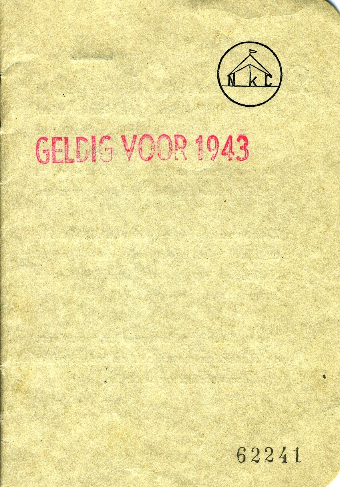 Een kampeerkaart van de A.N.W.B. op naam van Grietje E. de Vries te Den Haag afgegeven op 19 juli 1943 en geldig voor het jaar 1943. Op de eerste bladzijde is het predicaat Koninklijk voor Nederlandse Toeristenbond is doorgestreept.