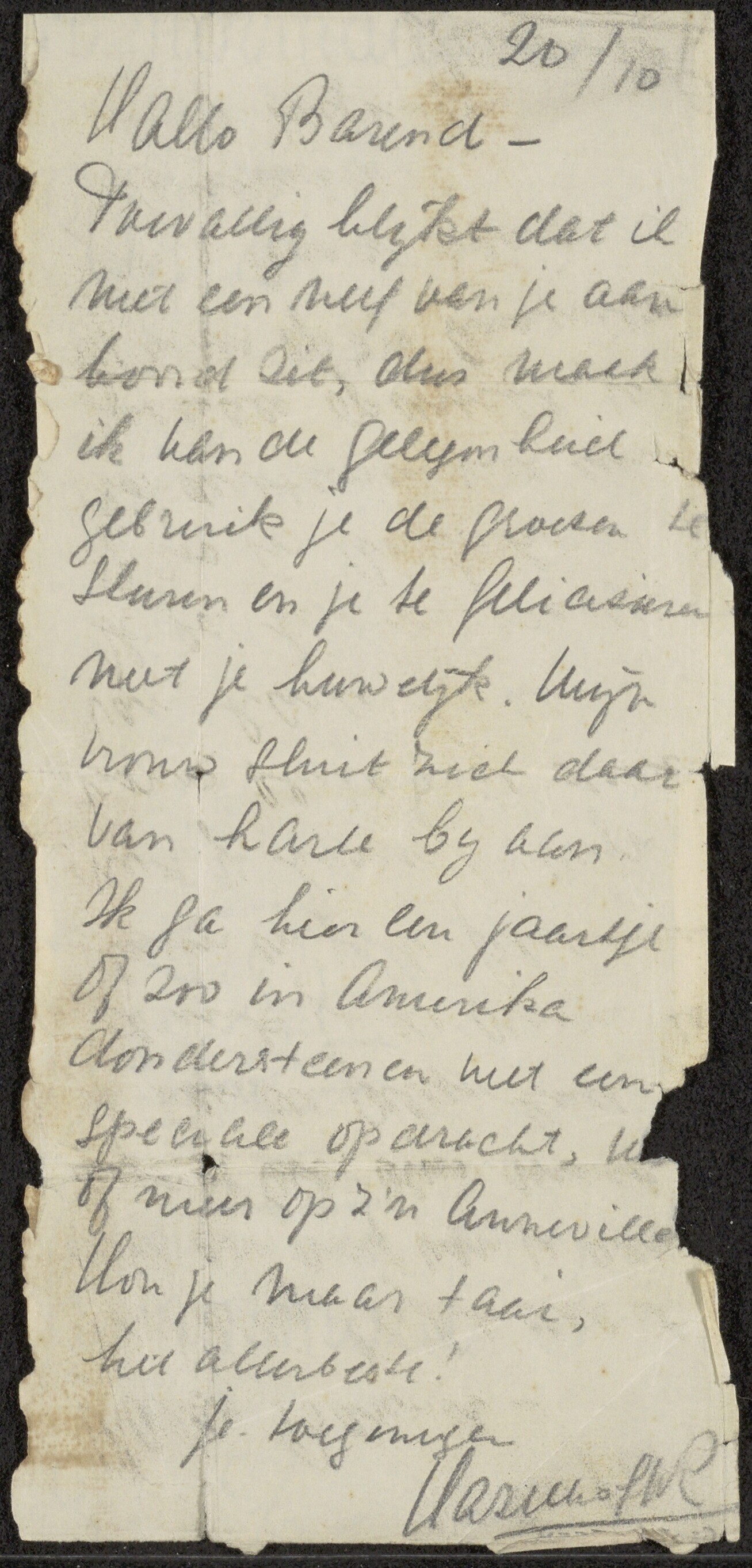 Een met potlood geschreven brief aan boord van een schip richting Amerika door Erik Hazelhoff Roelfzema waarin hij Barend Uiterwijk met zijn huwelijk feliciteert.