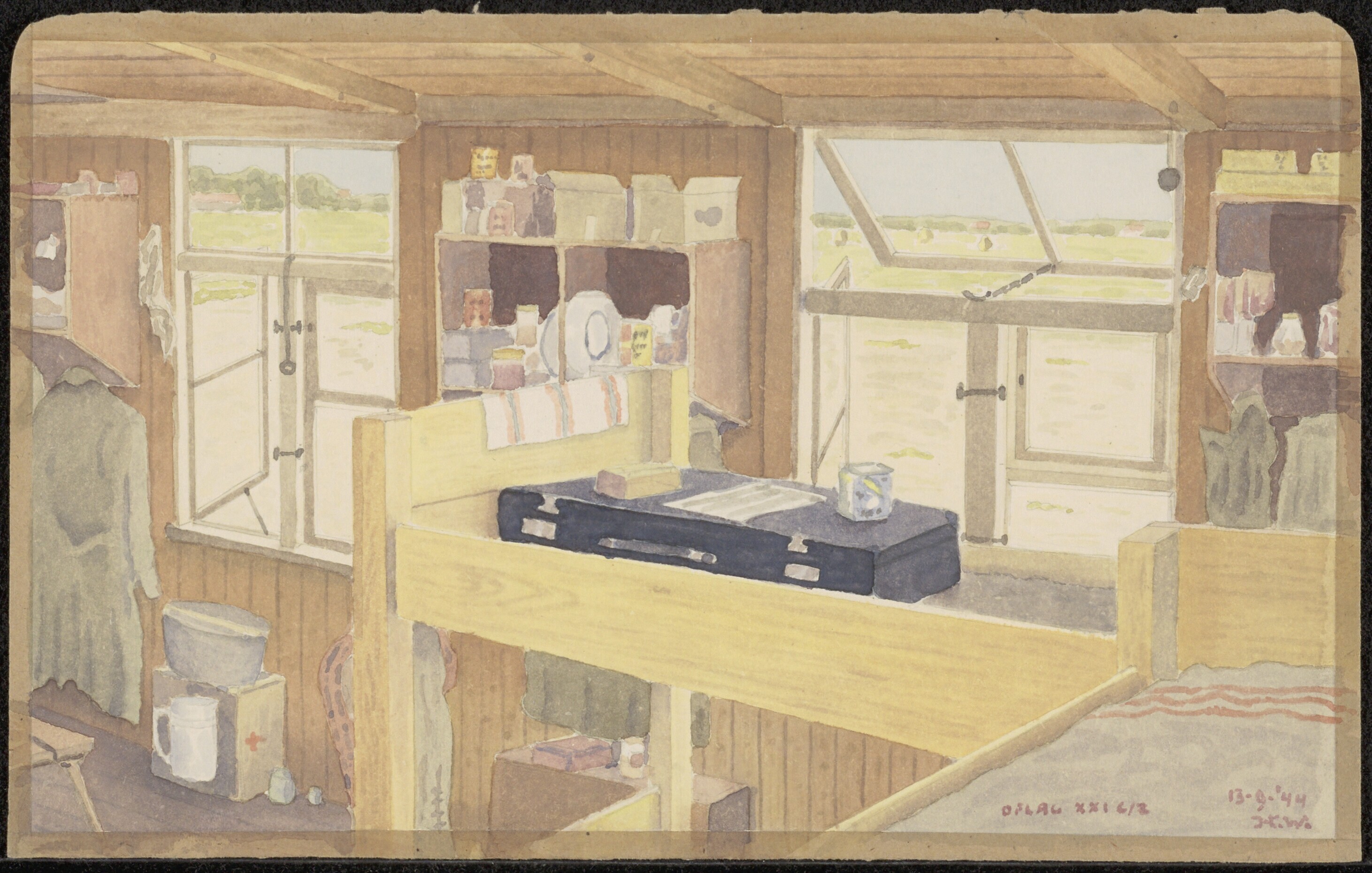 Een aquarel van het interieur van een barak met stapelbedden en persoonlijke bezittingen. Door de ramen een gezicht op een vlak landschap. De aquarel is vervaardigd door krijgsgevangene luitenant Henk Wingelaar. Rechtsonder staat: "Oflag XXI C/Z 13-9-'44 H.W."
