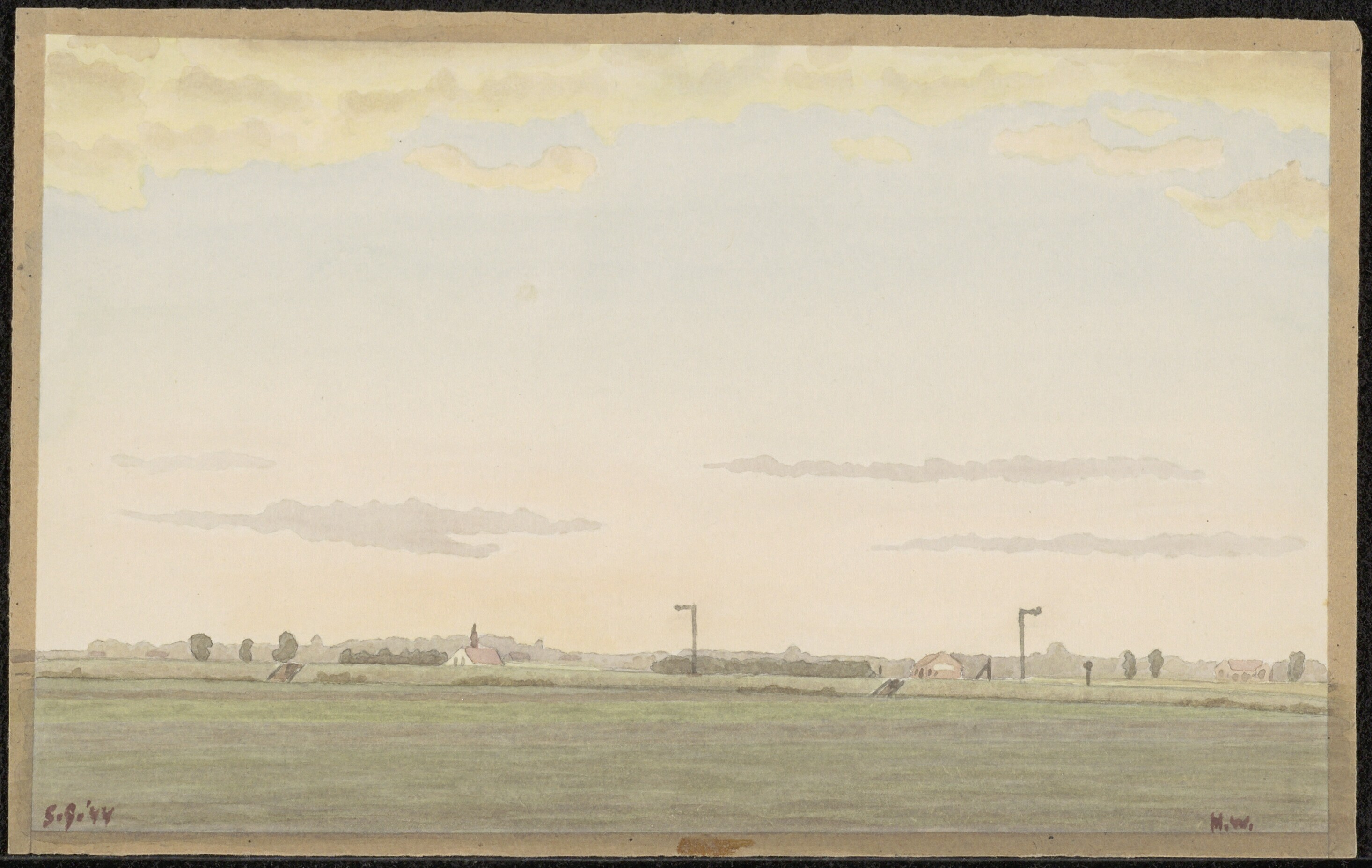 Een aquarel van het landschap bij het krijgsgevangenkamp Grune bei Lissa vervaardigd door krijgsgevangene luitenant Henk Wingelaar. Onderaan staat: "5-9-'44 H.W."