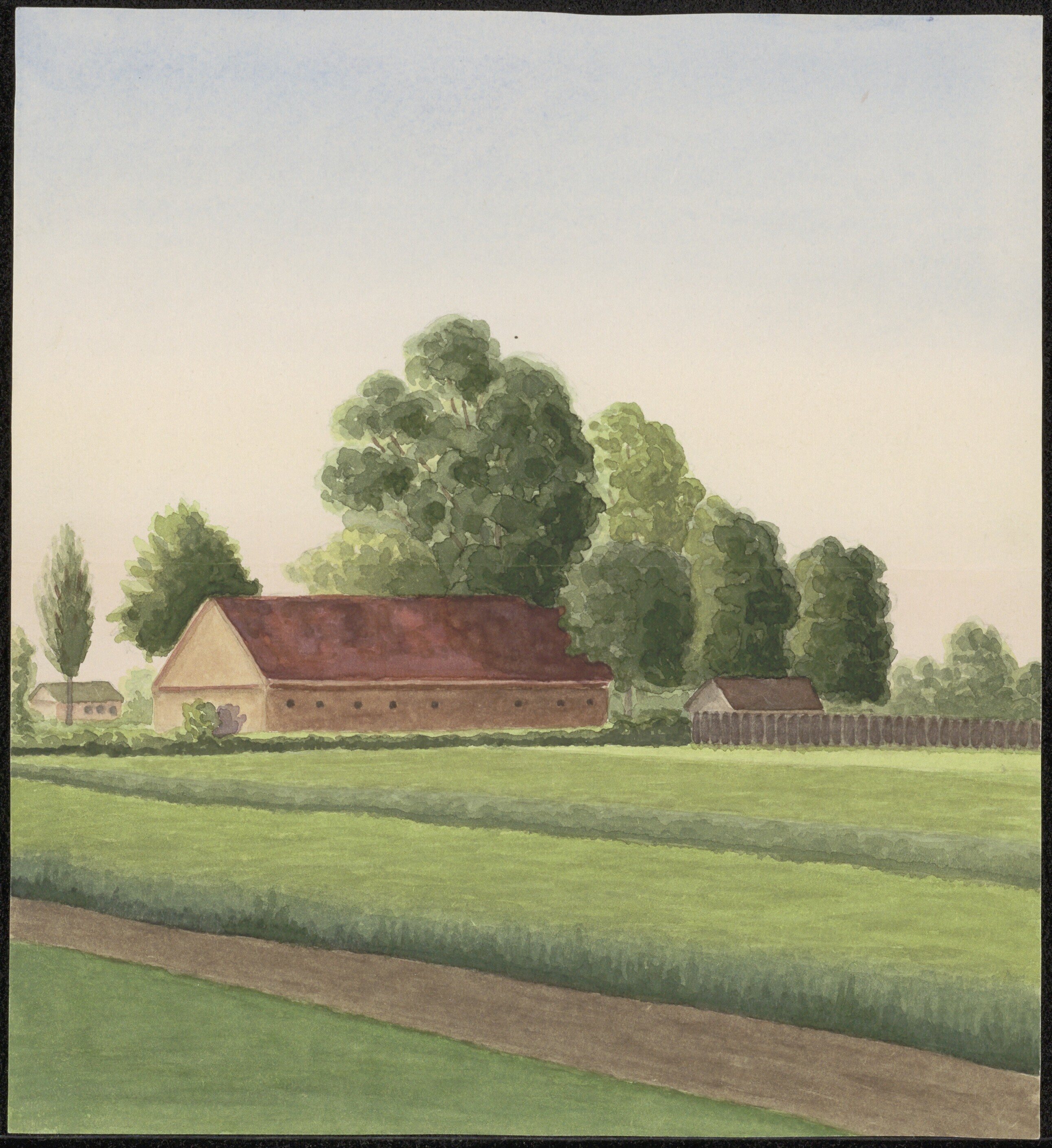 Een aquarel van een boerderij bij het krijgsgevangenkamp Grune bei Lissa vervaardigd door krijgsgevangene luitenant Henk Wingelaar. Op de achterkant staat: "Mei 1944".