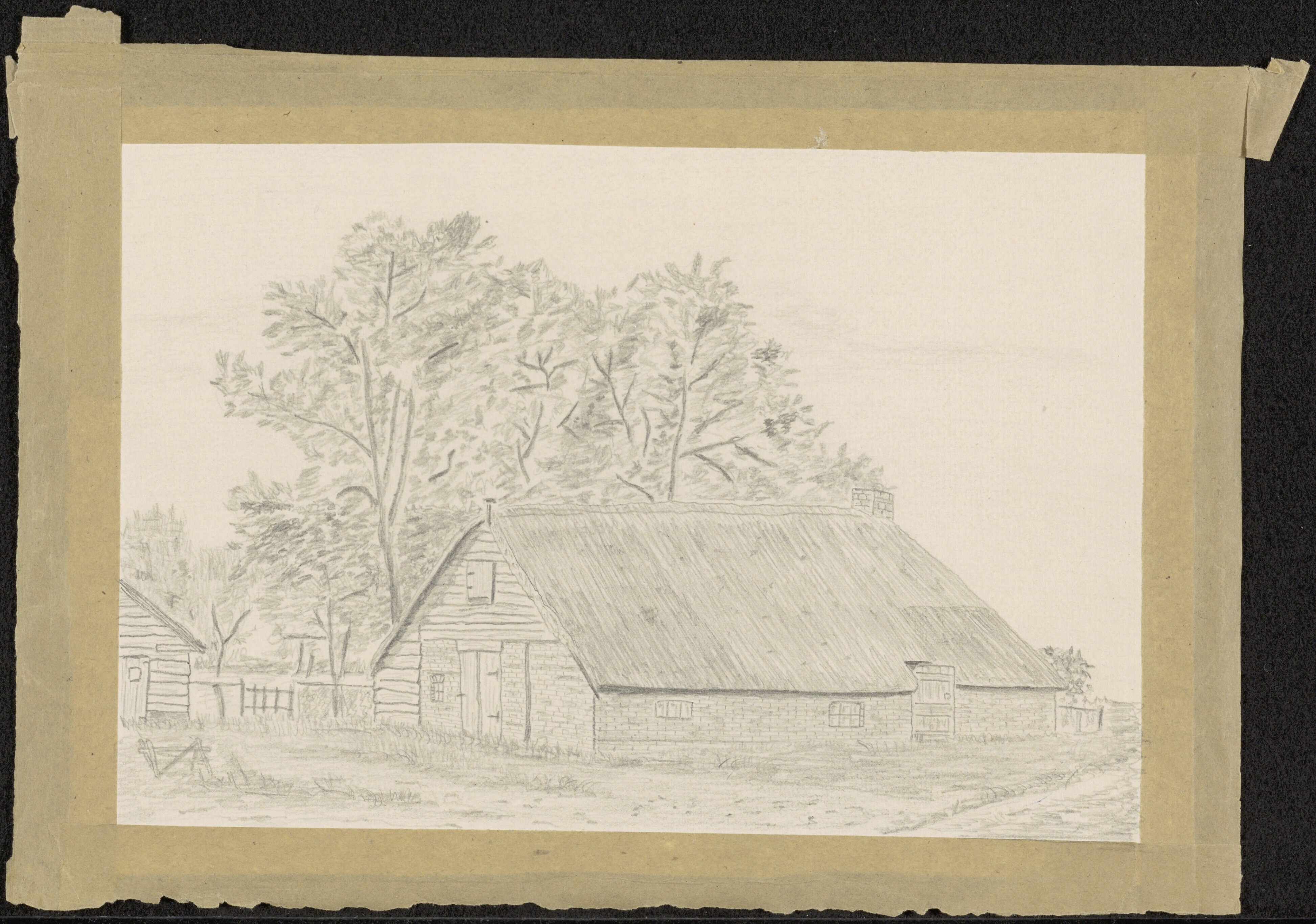 Een potloodtekening van een boerderij bij het krijgsgevangenkamp Grune bei Lissa vervaardigd door krijgsgevangene luitenant Henk Wingelaar.