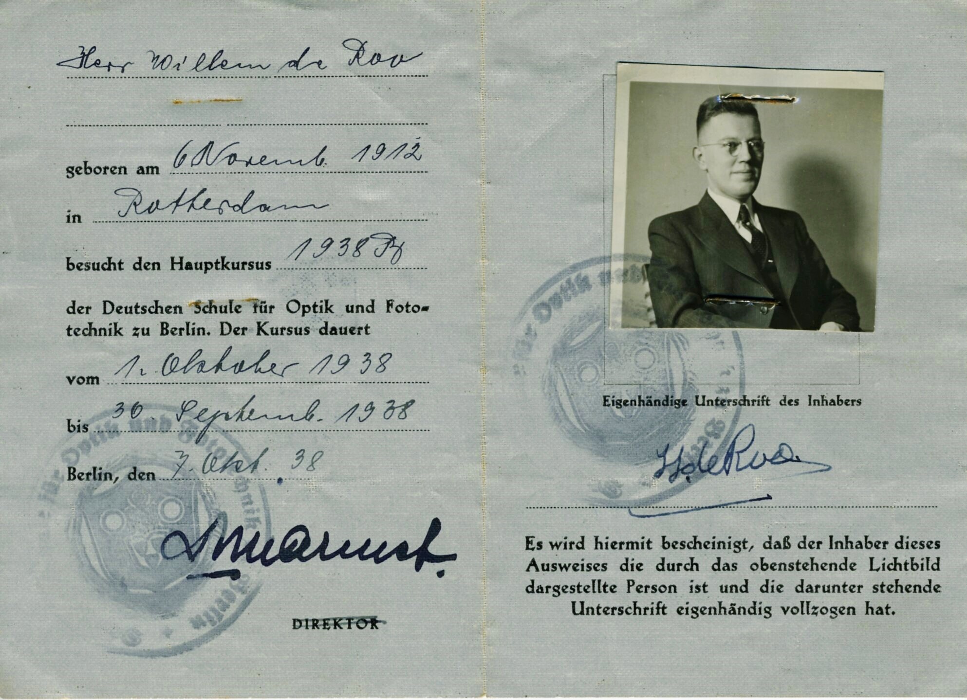 Een identiteitsbewijs met pasfoto en een verklaring voor de uitgave van openbaarvervoersbewijzen voor leerlingen op naam van Willem de Roo uit Scheveningen door de 'Deutsche Schule für Optik und Fototechnik zu Berlin'. De verklaring is in gotisch schrift gedrukt. Hierop staat dat hij van oktober 1938 tot september 1939 de school bezoekt. Op deze verklaring staat naast het stempel van de school een stempel met de afbeelding van het embleem van het Derde Rijk: de rijksadelaar met de swastika. Dit symbool is ook linksboven op de verklaring gedrukt.