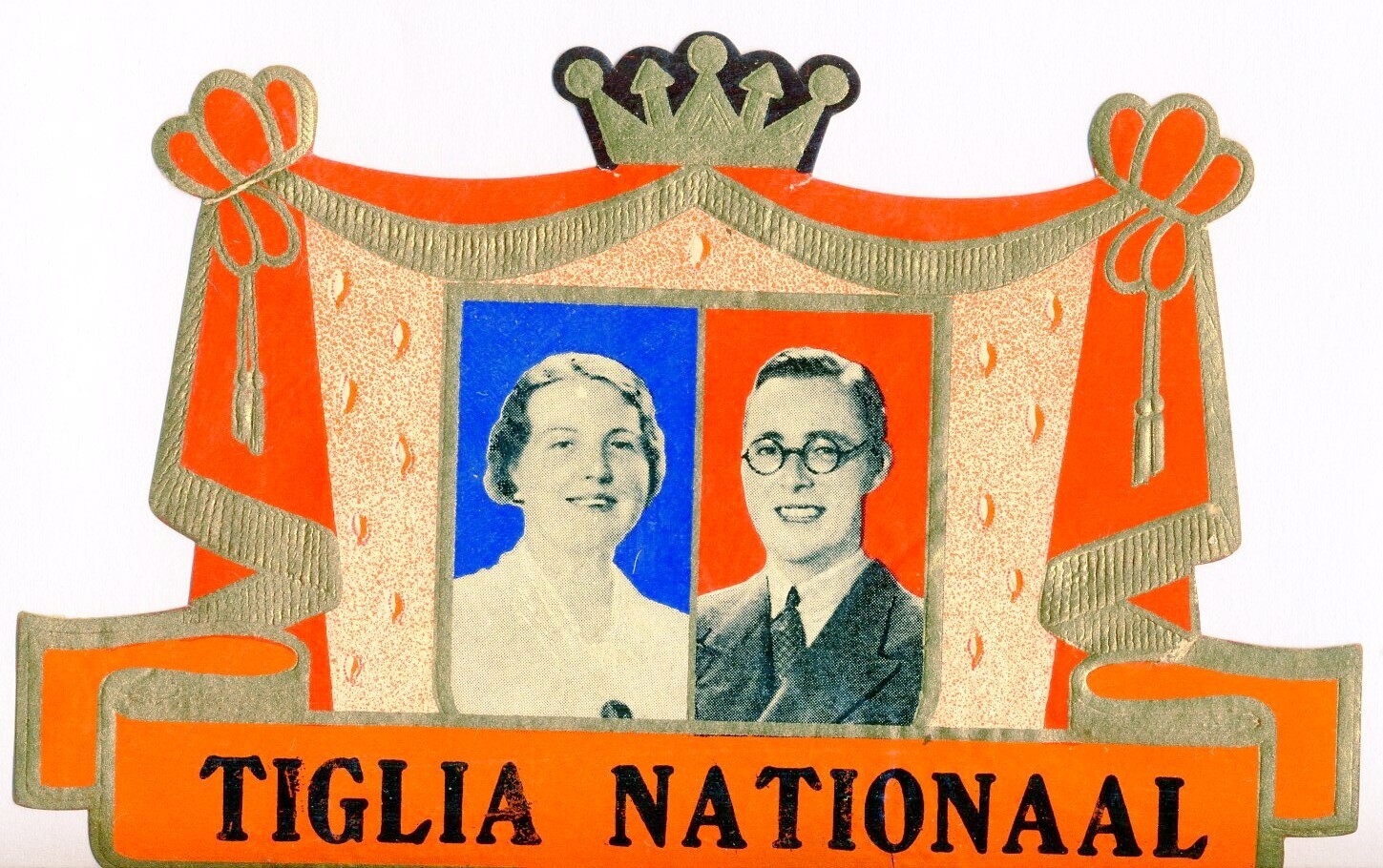Een verzameling anti-Duitse propaganda in de vorm van een etiket met een foto van Juliana en Bernhar...