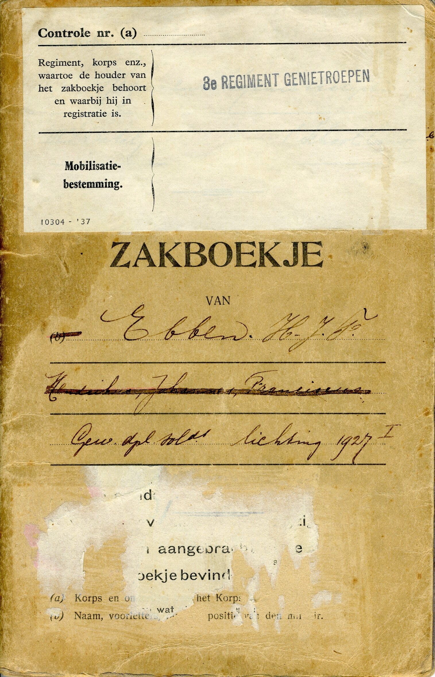 Een zakboekje van Hendrikus Johannes Franciscus Ebben gewezen dienstplichtig soldaat van lichting 1927 behorende bij het 3e regiment genietroepen. In het boekje staat o.a. genoteerd zijn beroep: chauffeur, wanneer hij teruggekomen is na zijn diensttijd voor oefening en de uitgereikte kleding en uitrusting. De laatste aantekening is in april 1939 gedaan. In het zakboekje zijn opgeborgen:<br>- een zwartwit foto van militairen bij een tent;<br>- een ansichtkaart van korporaal J.H. Niggebrugge van het commando Zeeland gericht aan zijn familie in Den Haag met een foto van kaartspelende militairen en de tekst: "Ferme jongens, stoere knapen, mogen graag en kaartje maken", afgestempeld te Hansweert in 1939;<br>- een "Nummerbewijs voor motorrijtuig" afgegeven op naam van H.J.F. Ebben te Den Haag op 3 juni 1933.
