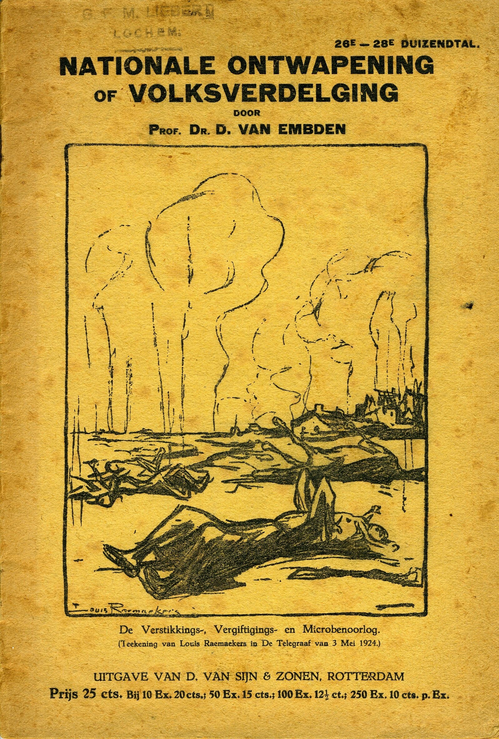 Een boek met de rede van Prof. Dr. D. van Embden gehouden bij de algemene beschouwingen over de staatsbegroting op 23 april 1924 in de Eerste Kamer der Staten-Generaal. Op de kaft een tekening van Louis Raemaekers getiteld: "De Verstikkings-, Vergiftigings- en Microbenoorlog."