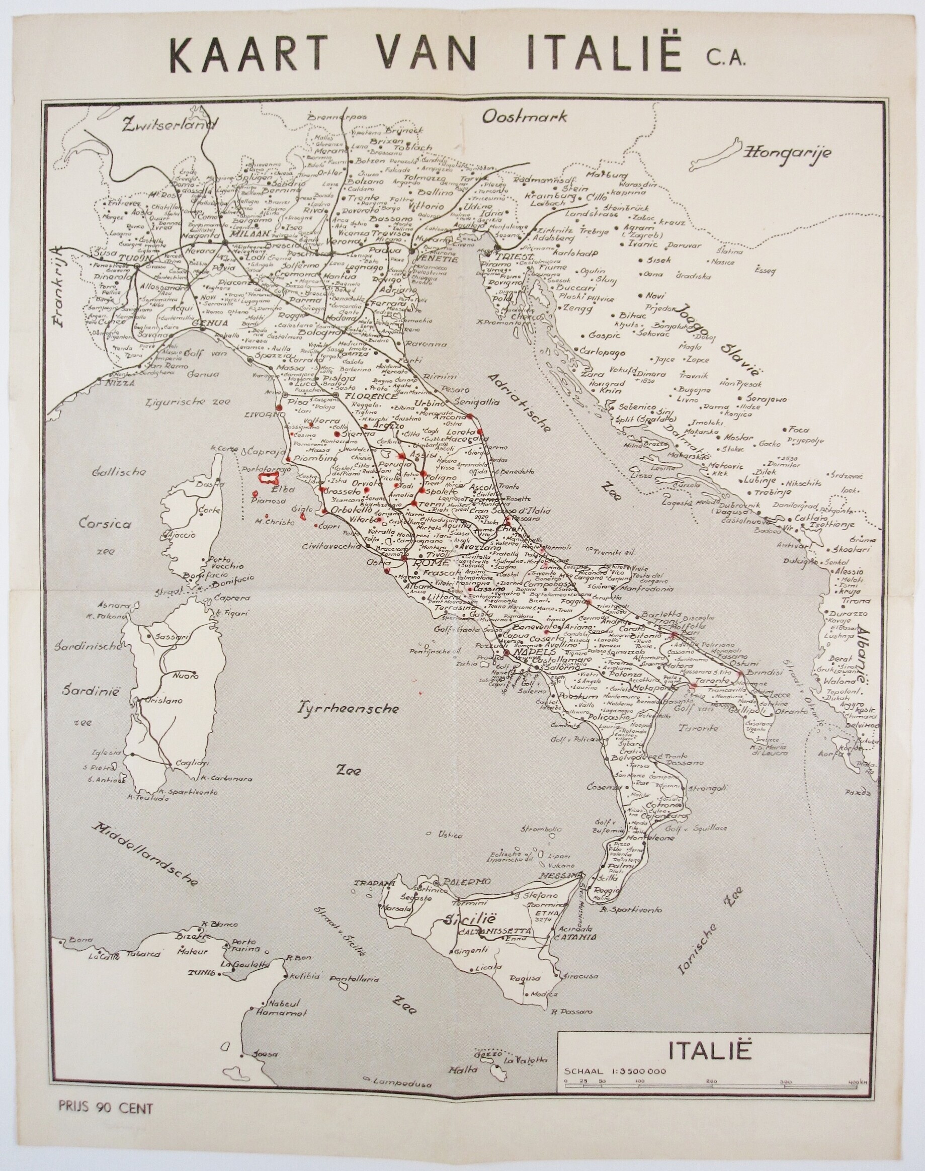 Een landkaart van Italië waarop de opmars van de geallieerden met rood is aangegeven.