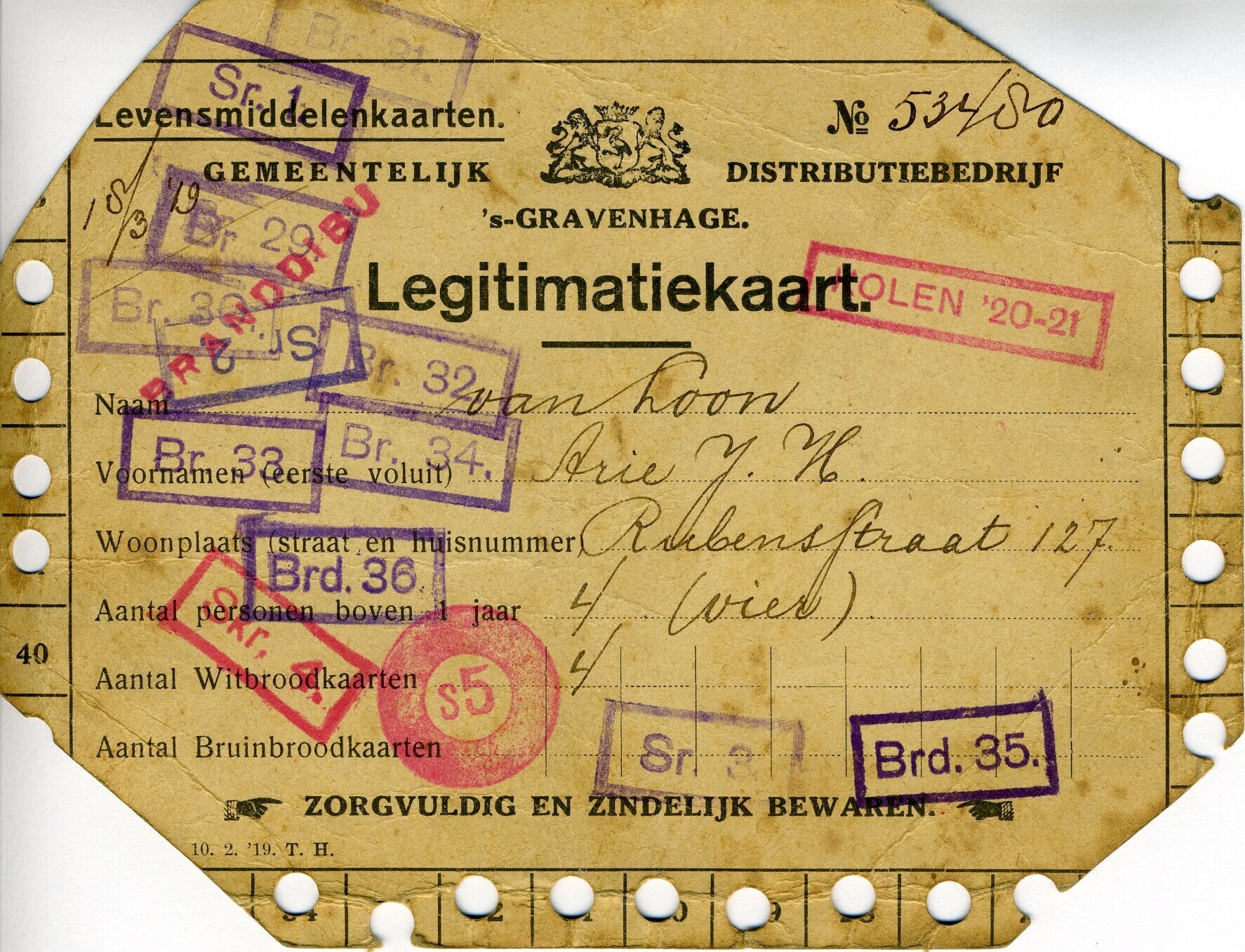 Een veelvuldig afgestempeld en van ponsgaten voorziene levensmiddelenkaart uitgegeven door het Gemeentelijk Distributiebedrijf 's-Gravenhage op naam van Arie J.H. van Loon.