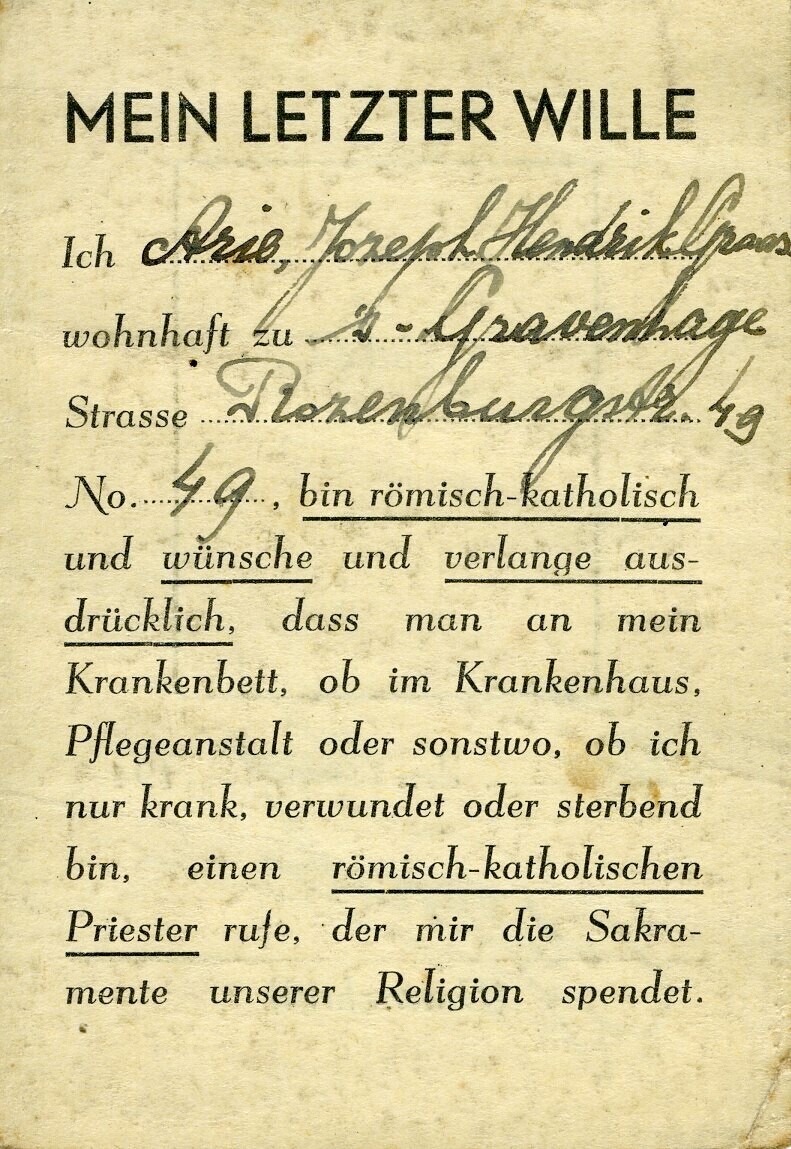Een verklaring opgesteld in het Duits met als titel: "Mein letzter Wille" waarin Arie Joseph Hendrik Graas verzoekt om een Rooms-Katholiek priester bij zijn ziek- en/of sterfbed.