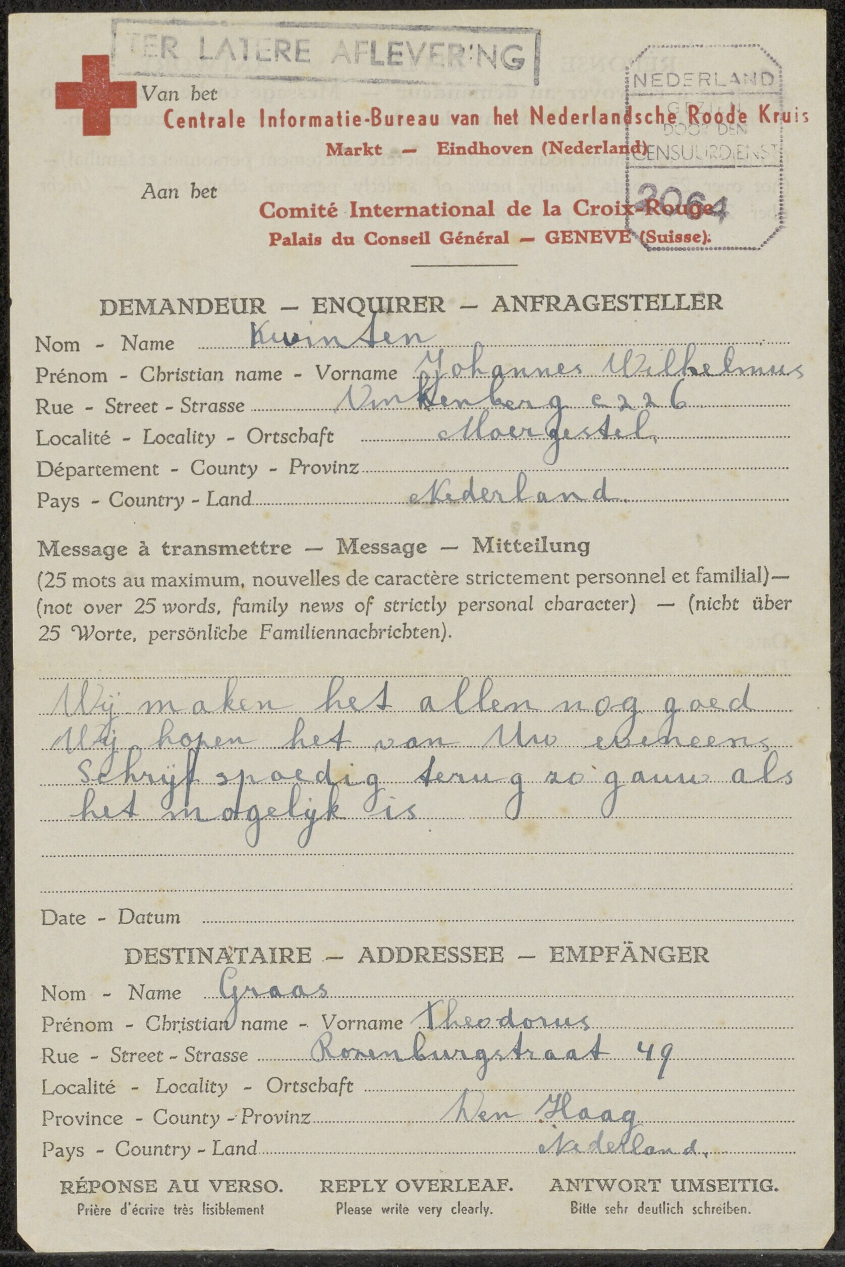 Een voorgedrukte brief van het "Centrale Informatie-Bureau van het Nederlandsche Rode Kruis" te Eindhoven aan het "Comité International de la Croix Rouge" te Genève met een bericht van Johannes Wilhelmus Kwinten te Moergestel dat het hen allen nog goed gaat gericht aan Theodorus Graas te Den Haag. Rechtsboven een stempel van de Nederlandse censuur.