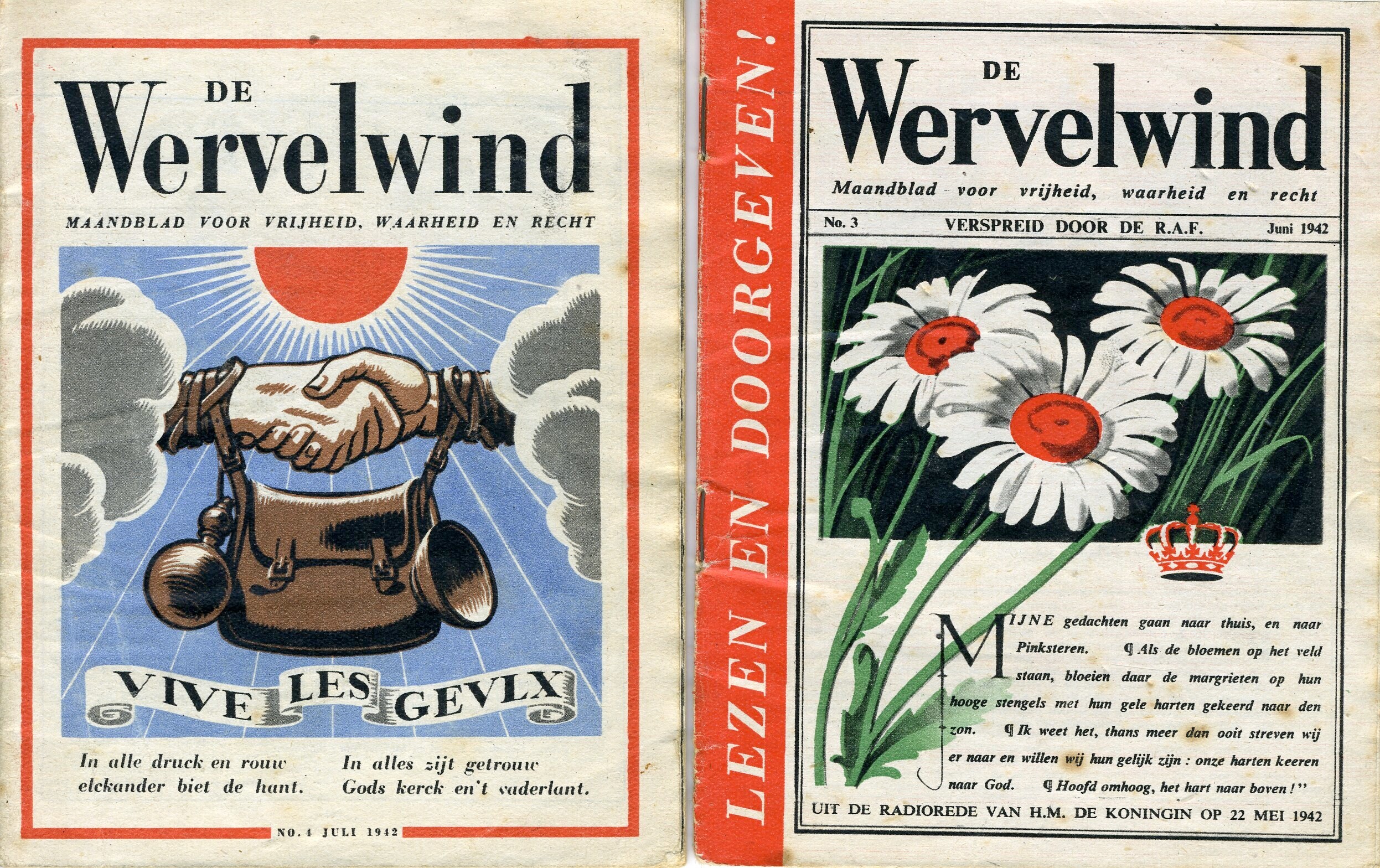 Twee exemplaren van "De Wervelwind. Maandblad voor vrijheid, waarheid en recht" verspreid door de R.A.F. Een exemplaar van 1 juli 1942 met een tekening in kleurendruk van twee handen met elkaar verbonden door een ransel met fles en nap die elkaar een hand geven onder een stralende zon. Daaronder "Vive les Gevlx" (vive les gueux). Een exemplaar van juni 1942 met een tekening in kleurendruk van drie margrieten. Op de achterkant van beide een klimmende Nederlandse Leeuw en: "Verspreiding van deze artikelen, in welke vorm dan ook, dient de nationale zaak. Lezen en doorgeven".