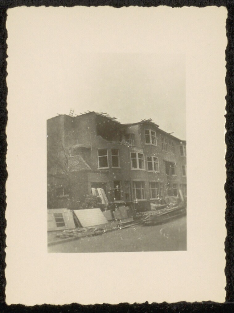 Twee zwartwit foto's van de afbraak voor de Atlantikwall van de huizen aan de Beeklaan: een foto met nr. 1: 13 december 1942, initialen: AvV (A. van Vliet); een foto met nummer 3 (met potlood op de achterkant: Beeklaan bij Vrijz. Herv. Kerkje. Op achtergrond hotel "Olympic"): 27 december 1942, initialen: AvV (A. van Vliet).