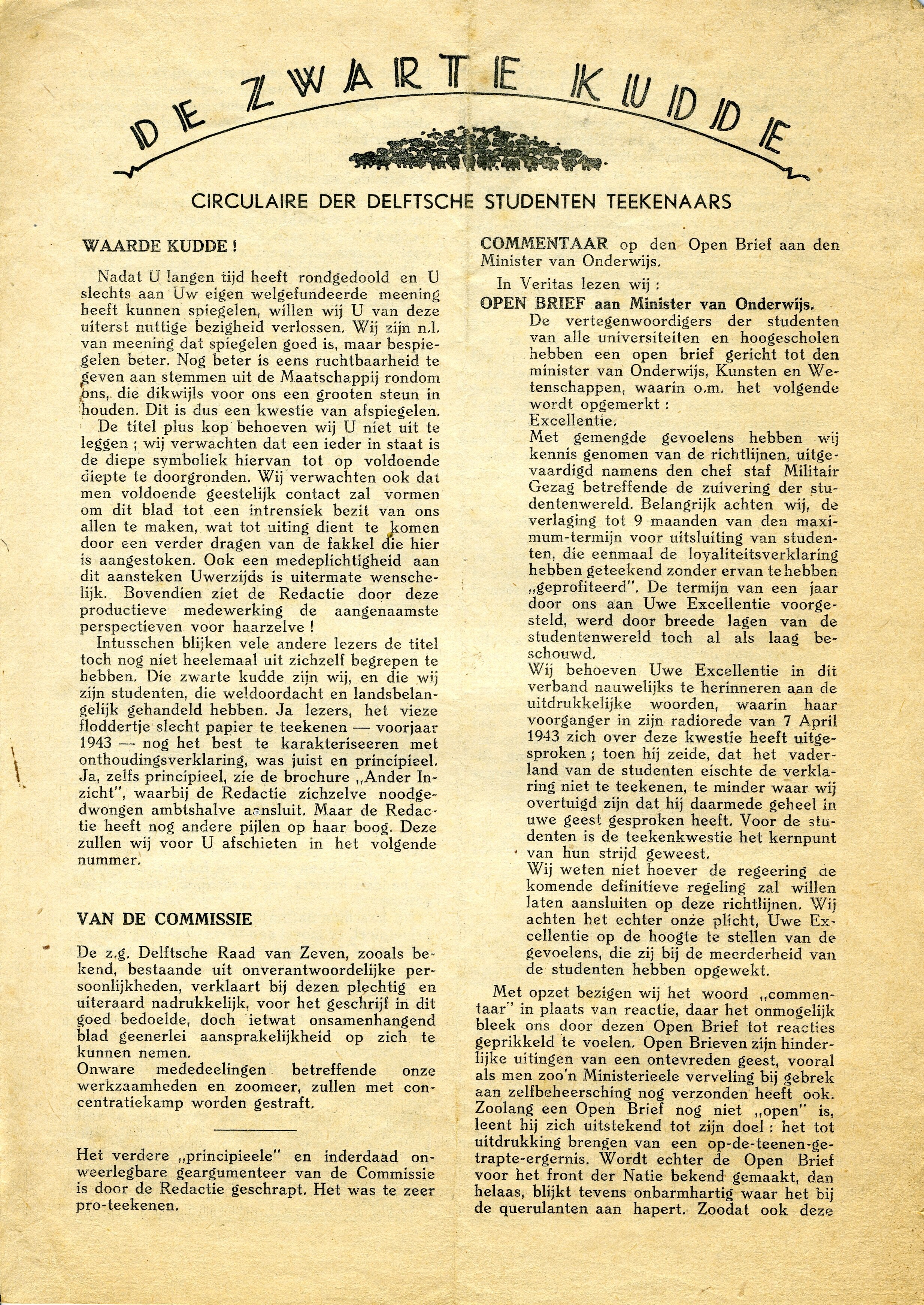 Circulaire van de Delftsche Studenten Teekenaars van de loyaliteitsverklaring in het voorjaar van 1943. In deze editie is een open brief aan de Minister van Onderwijs opgenomen over de zuivering in de studentenwereld.
