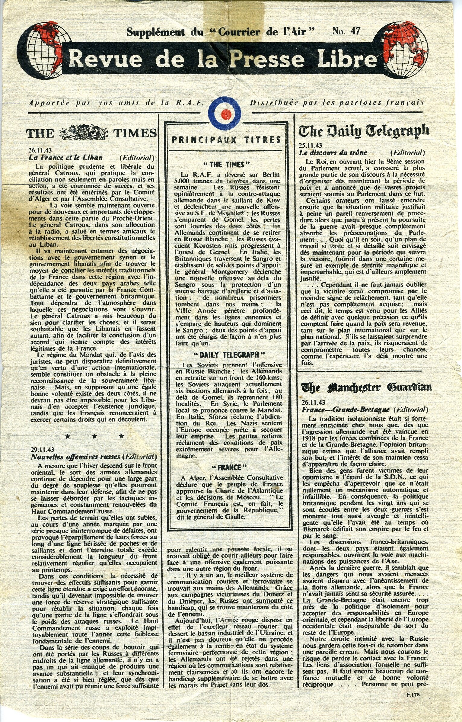 Revue de la Presse Libre is een pamflet dat door de R.A.F. werd verspreid over Frankrijk. Het is een bijlage bij ''Courier de l'Air'' met vertaalde artikelen uit Britse kranten van november 1943. Het betreft nummer 47.