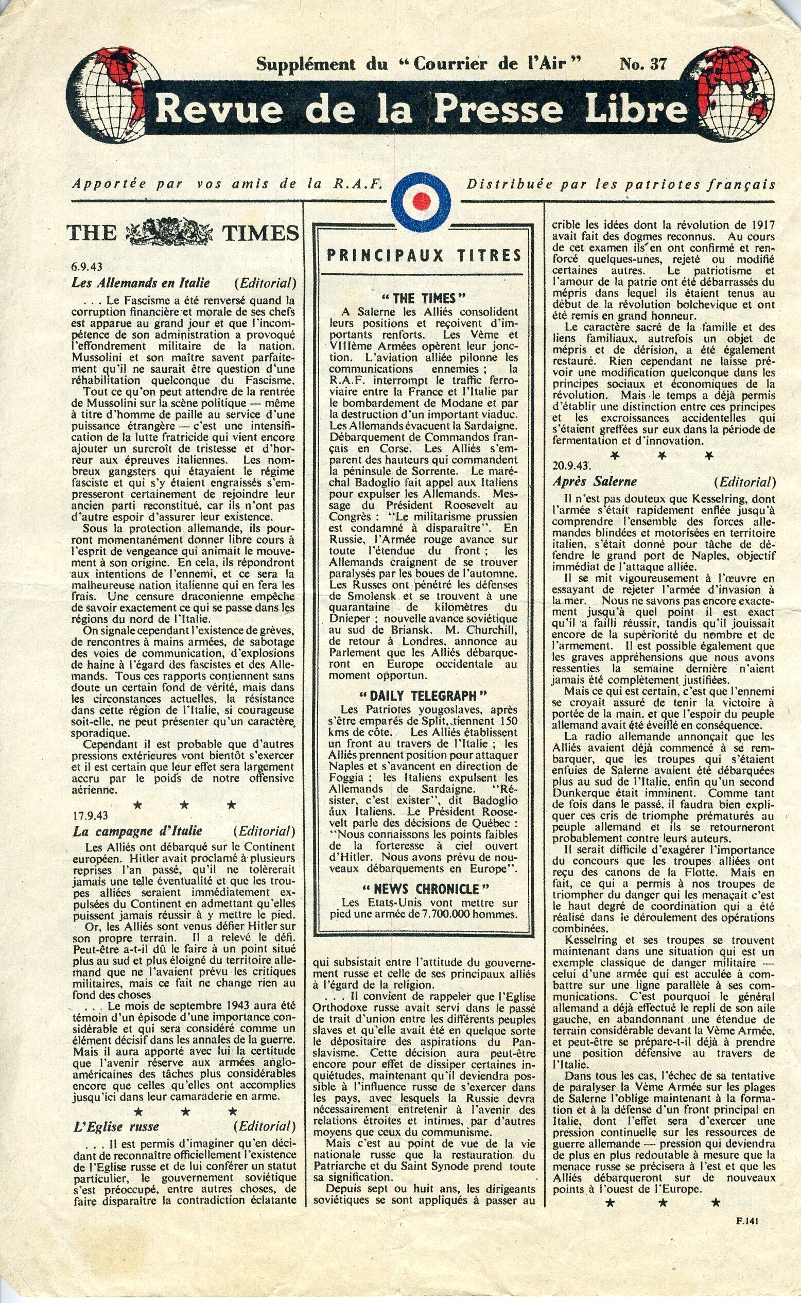 Revue de la Presse Libre is een pamflet dat door de R.A.F. werd verspreid over Frankrijk. Het is een bijlage bij ''Courier de l'Air'' met vertaalde artikelen uit Britse kranten van september 1943. Het betreft nummer 47.