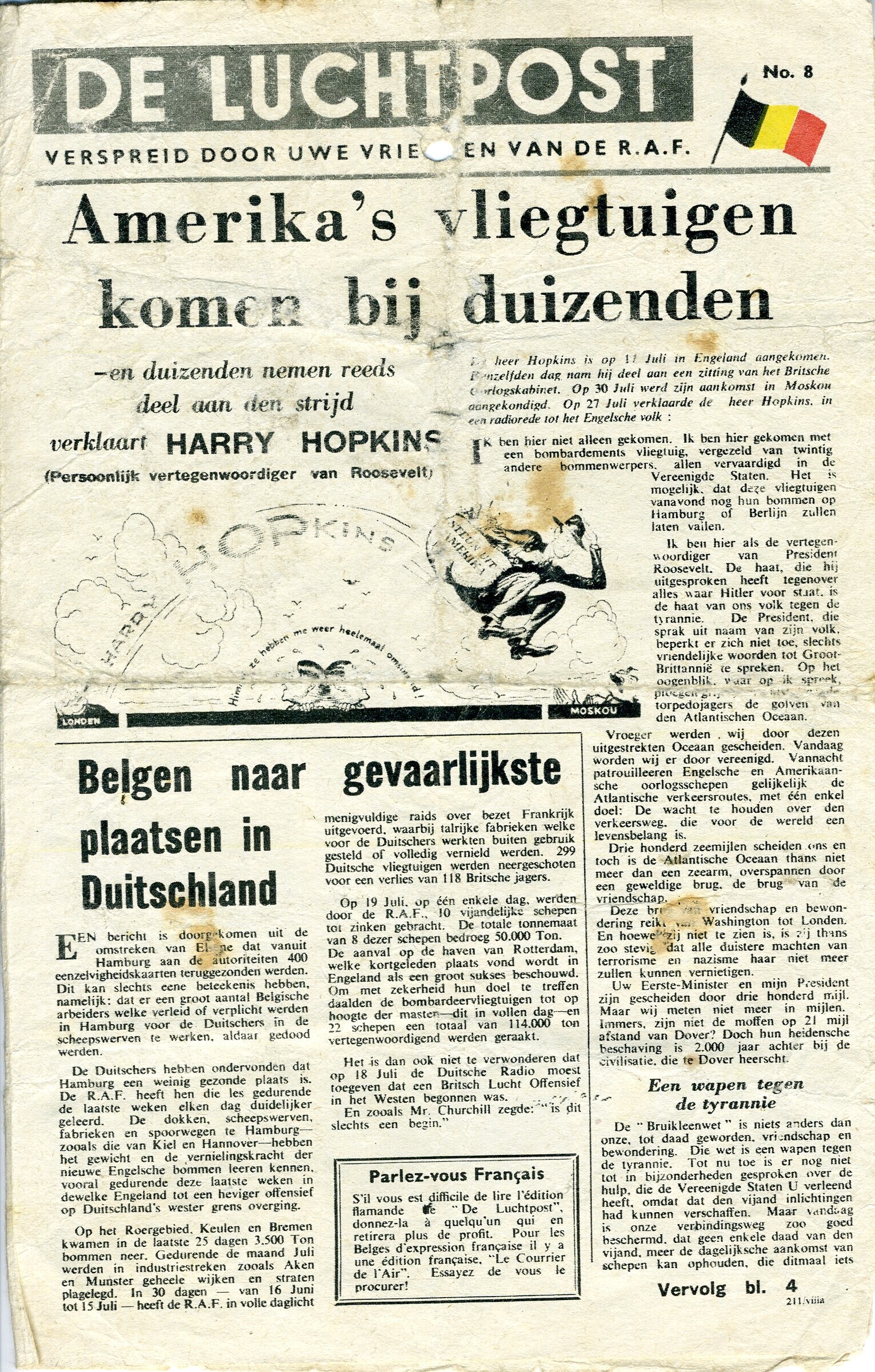 Editie nummer 8 van ''De Luchtpost''. Het pamflet werd door de R.A.F. boven België uitgeworpen. Nummer 8 dateert van juli 1943 en gaat onder andere over de dagbombardementen van de geallieerden boven Duitsland.