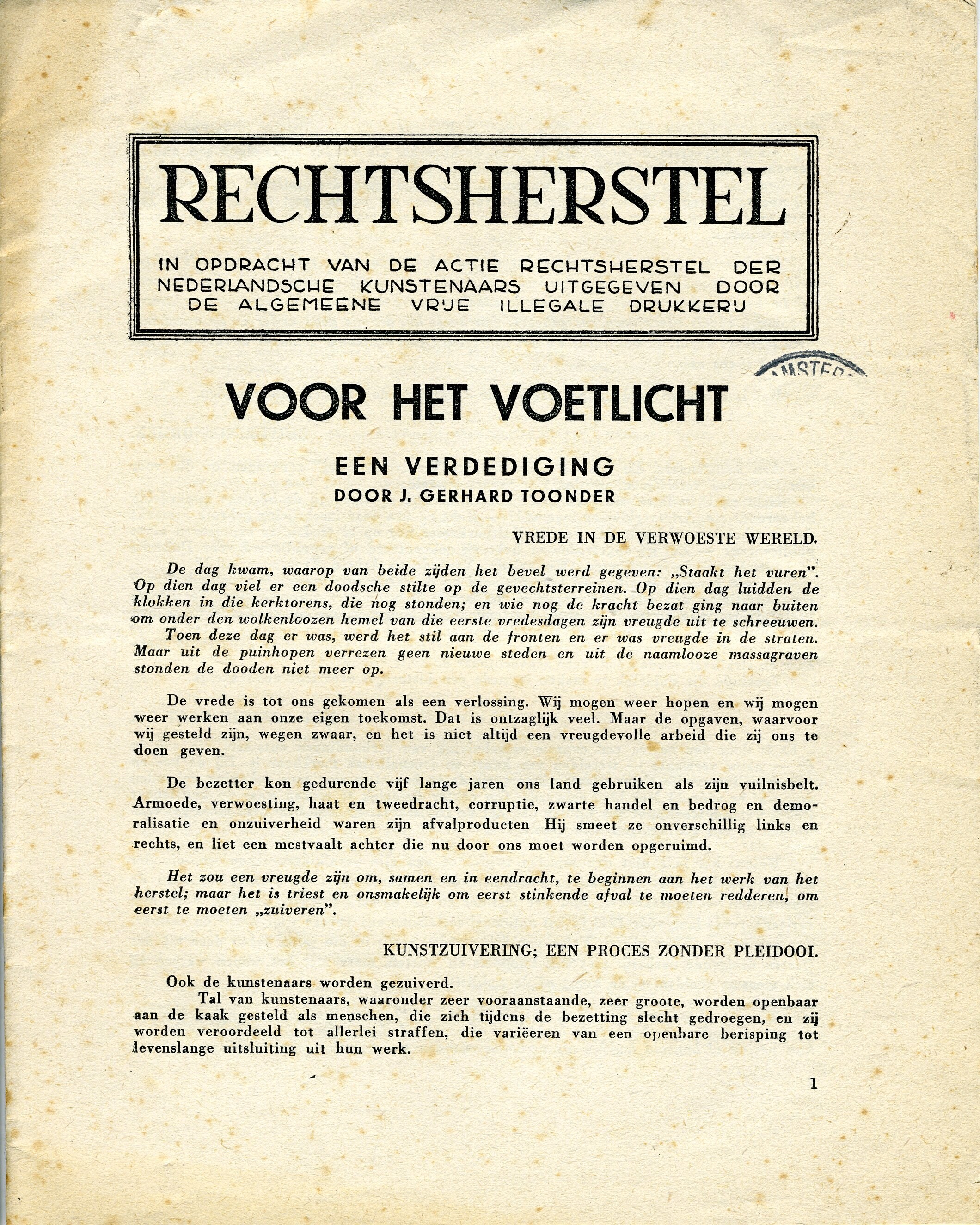 Een boekje met de titel: Rechtsherstel voor het voetlicht een verdediging door J. Gergard Toonder in opdracht van de actie rechtsherstel der Nederlandsche kunstenaars uitgegeven door de algemeene vrije illegale drukkerij". In het boekje een losse aanmeldingskaart voor het lidmaatschap van de vereniging.