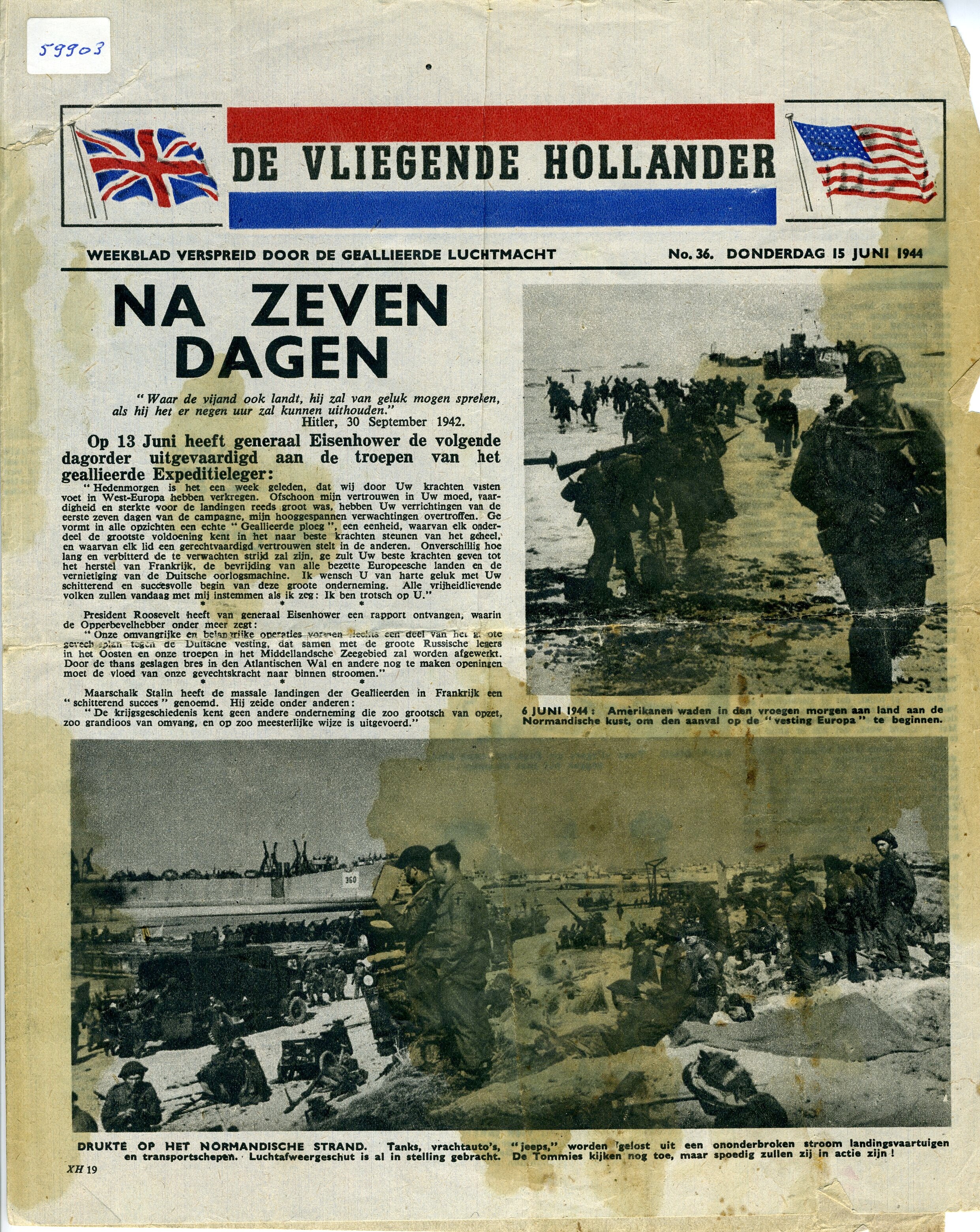 Editie 36 van donderdag 15 juni 1944 van de verzetskrant ''De Vliegende Hollander''. De krant werd verspreid door de geallieerde luchtmacht. In deze editie aandacht voor D-day.