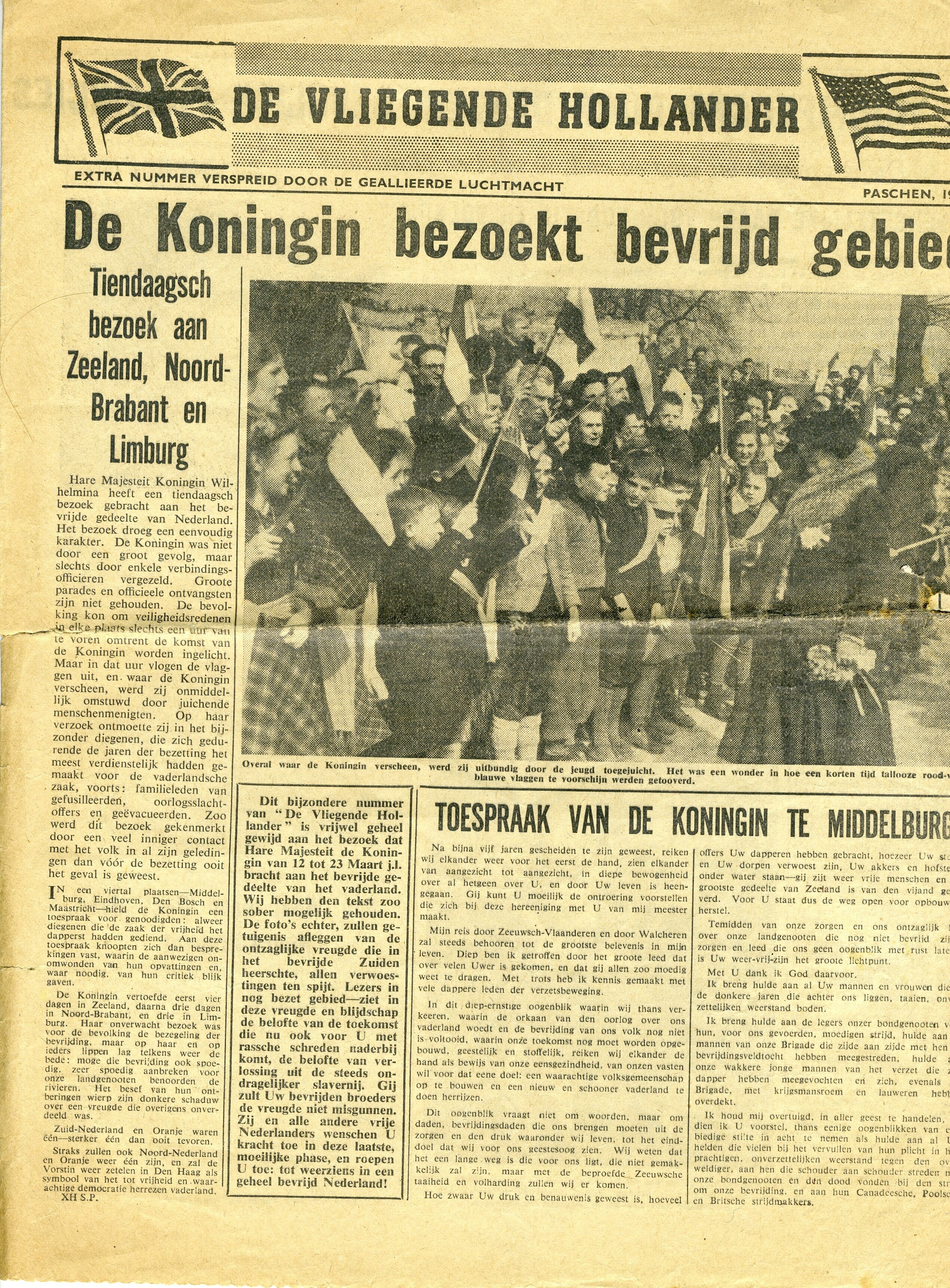 Extra nummer van Pasen 1945 van de verzetskrant ''De Vliegende Hollander''. De krant werd verspreid door de geallieerde luchtmacht. Deze editie is gewijd aan het bezoek van koningin Wilhelmina aan het bevrijde deel van Nederland.