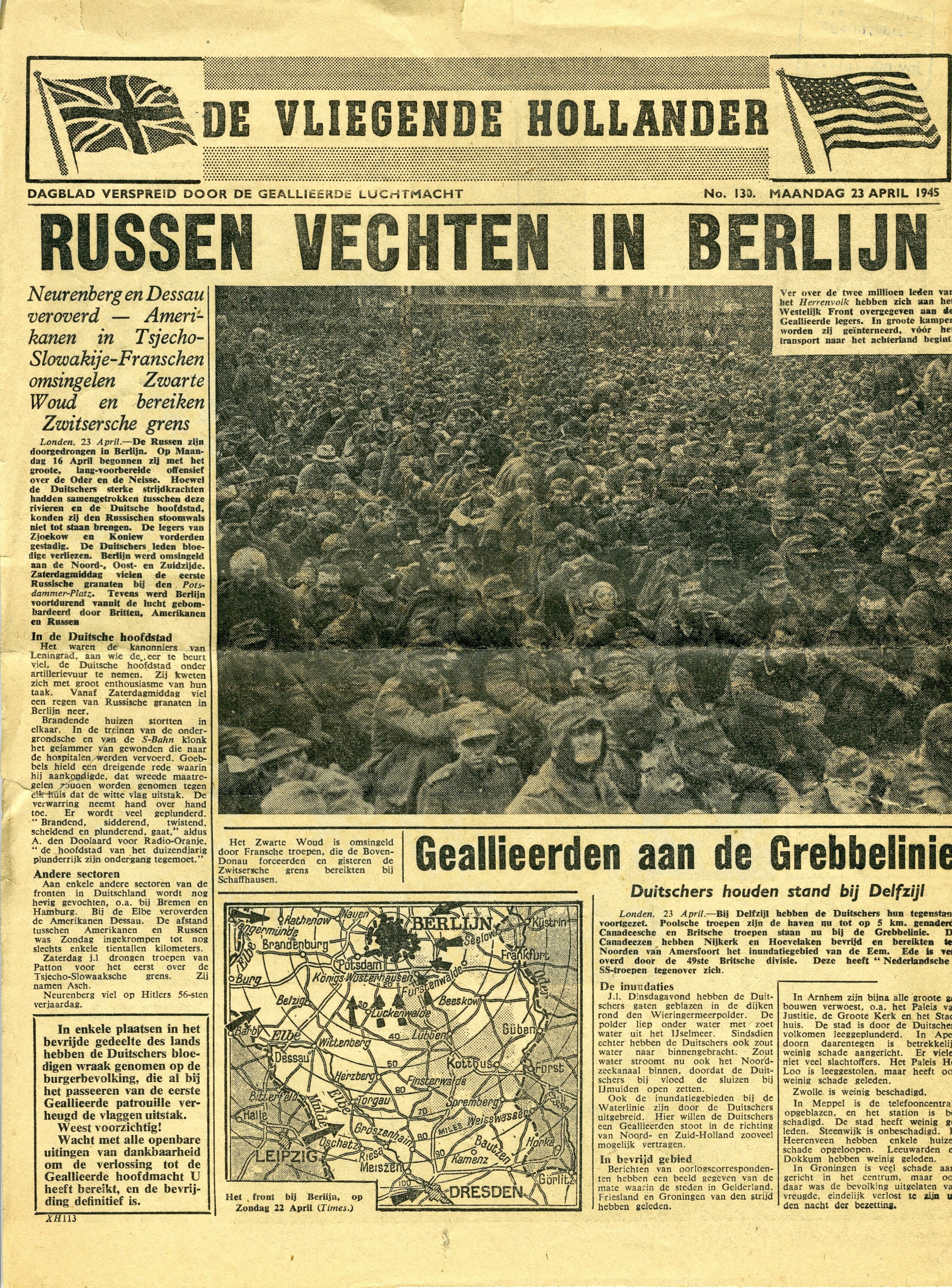 Editie 130 van maandag 23 april 1945 van de verzetskrant ''De Vliegende Hollander''. De krant werd verspreid door de geallieerde luchtmacht. In deze editie aandacht voor de strijd om Berlijn en de arrestatie van Max Blokzijl.