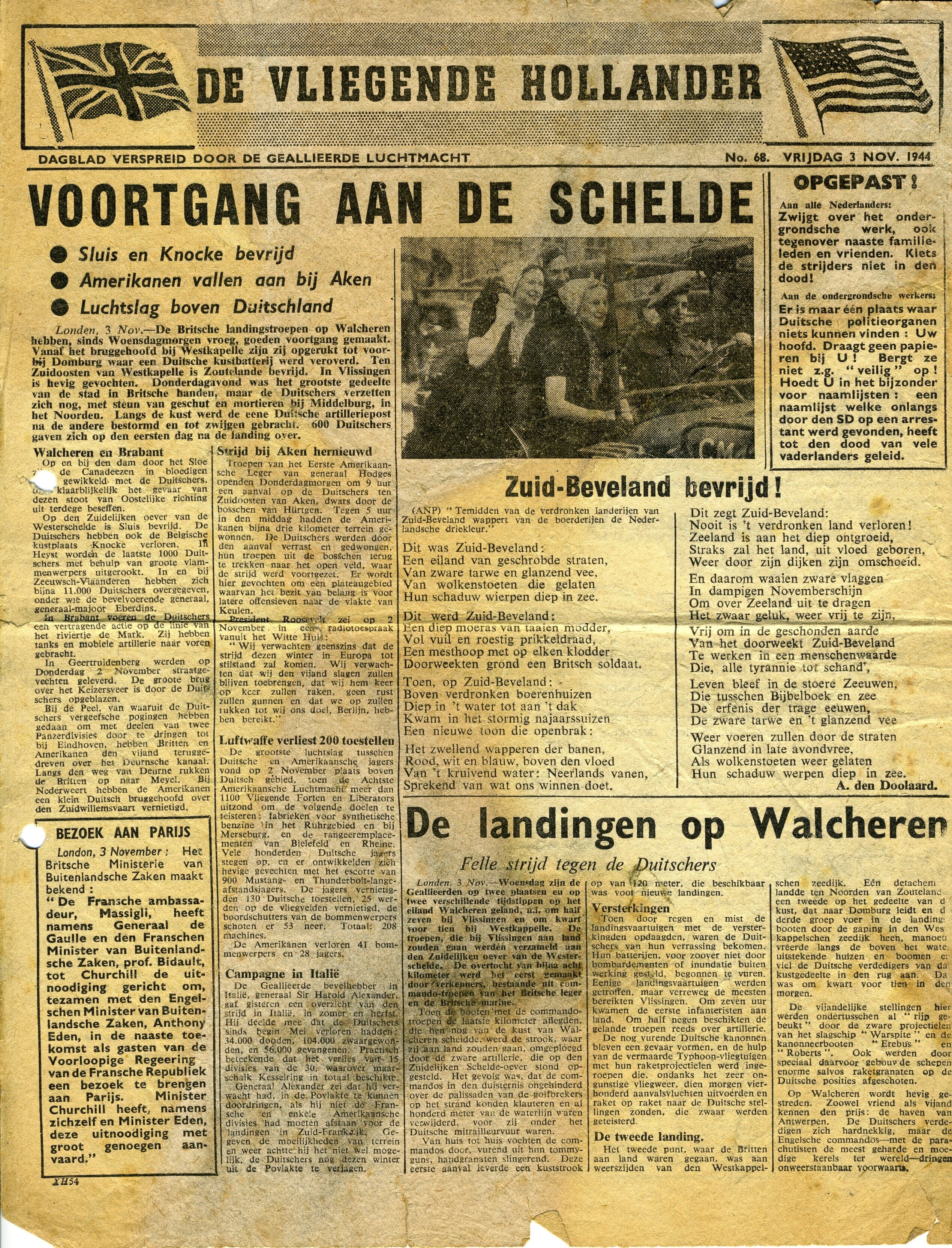 Editie 68 van vrijdag 3 november 1944 van de verzetskrant ''De Vliegende Hollander''. De krant werd verspreid door de geallieerde luchtmacht. In deze editie aandacht voor de strijd bij de Schelde.