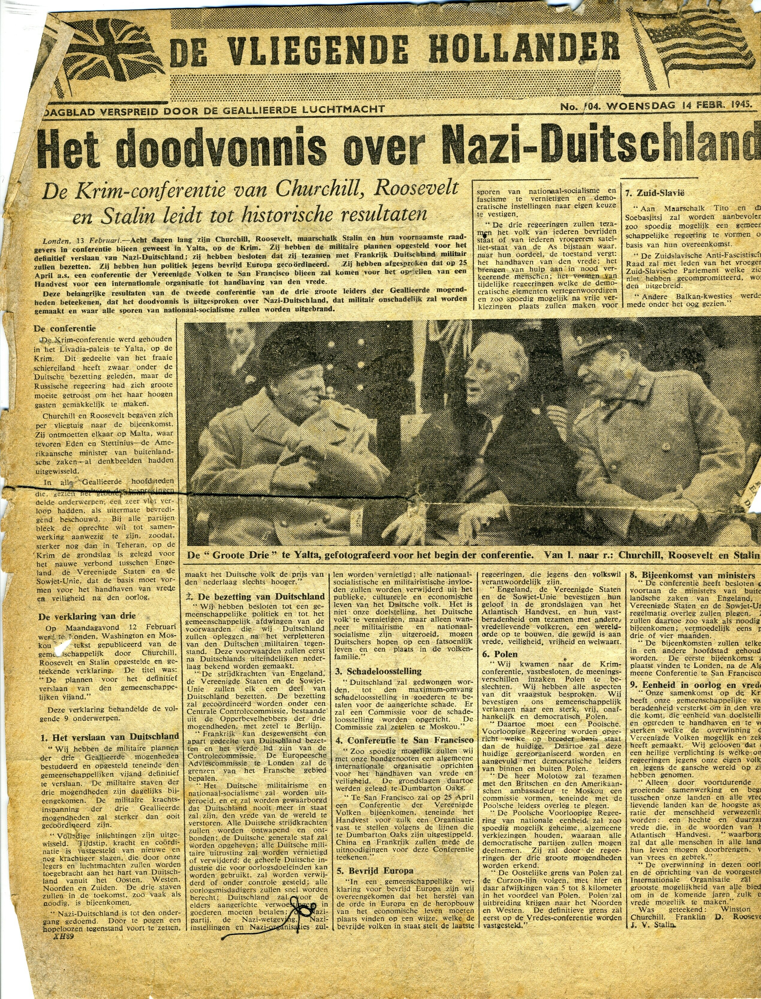Editie 104 van woensdag 14 februari 1945 van de verzetskrant ''De Vliegende Hollander''. De krant werd verspreid door de geallieerde luchtmacht. In deze editie aandacht voor de conferentie op de Krim.