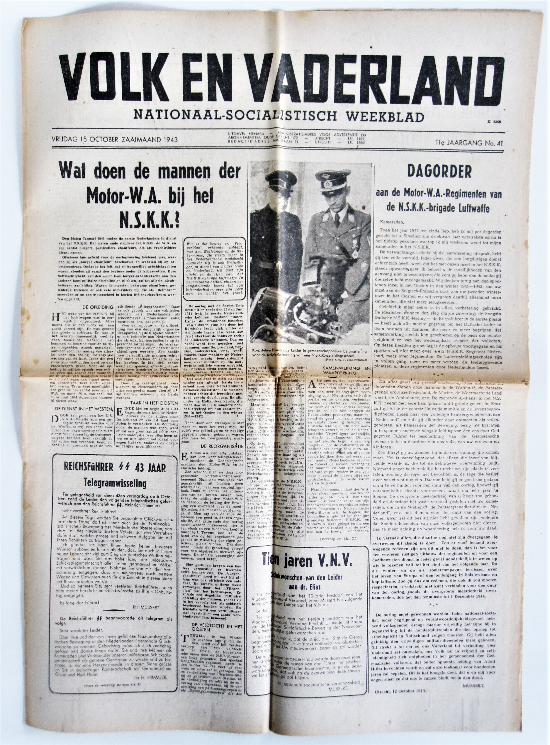 Jaargang elf van 'Volk en Vaderland', nationaalsocialistisch weekblad van de N.S.B. Het betreft 1 exemplaar van No. 41, vrijdag 15 october-zaaimaand1943.