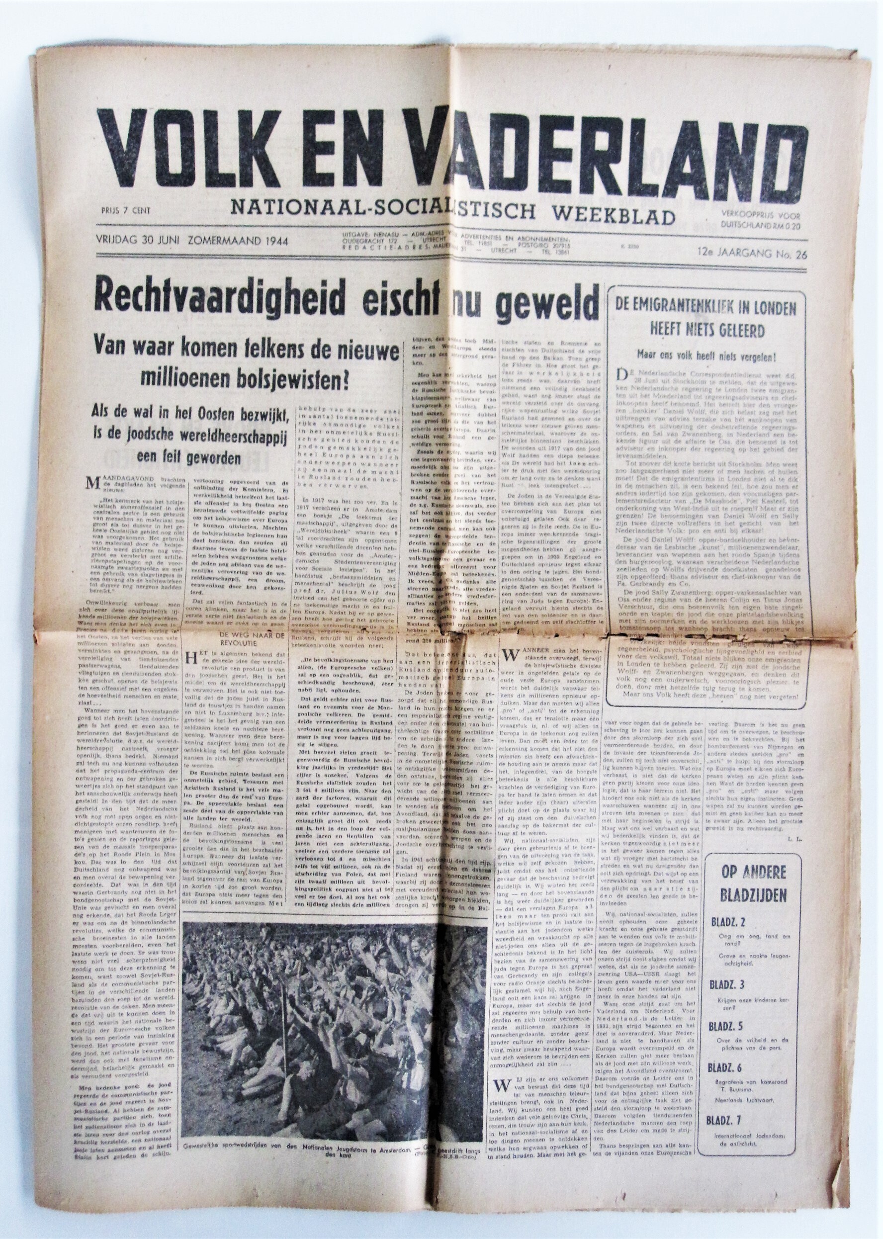 Jaargang twaalf van 'Volk en Vaderland', nationaalsocialistisch weekblad van de N.S.B. Het betreft 1 exemplaar van No. 26, vrijdag 30 juni-zomermaand 1944.